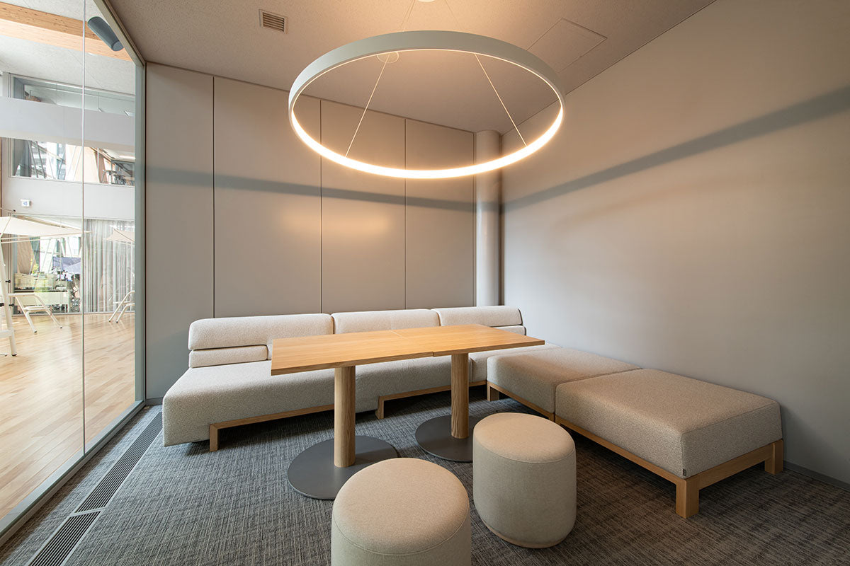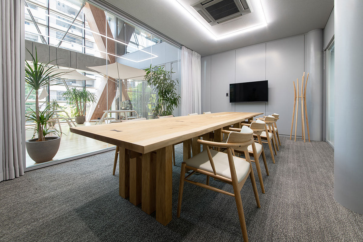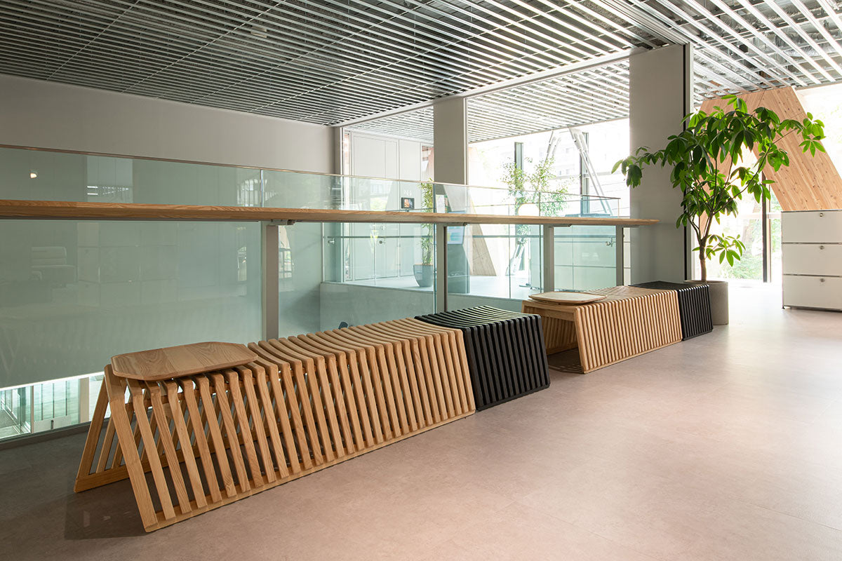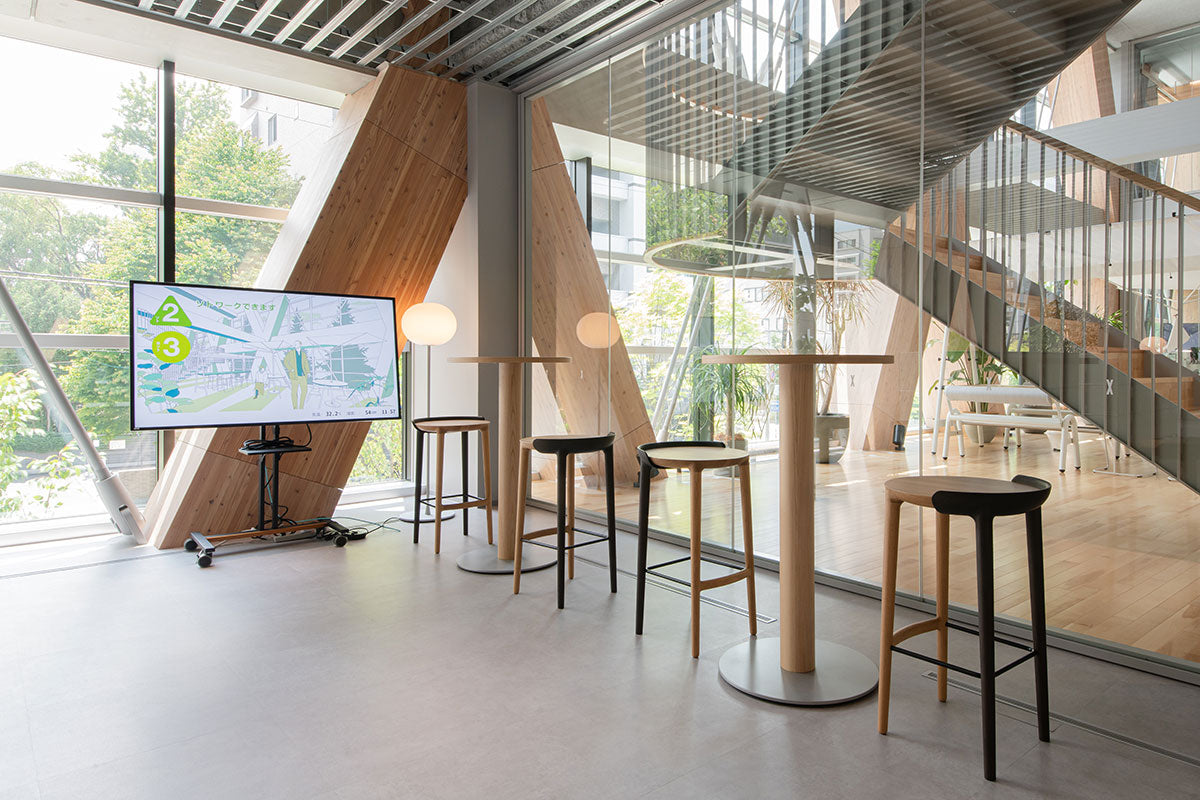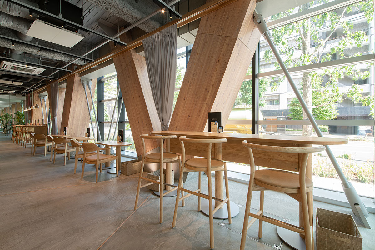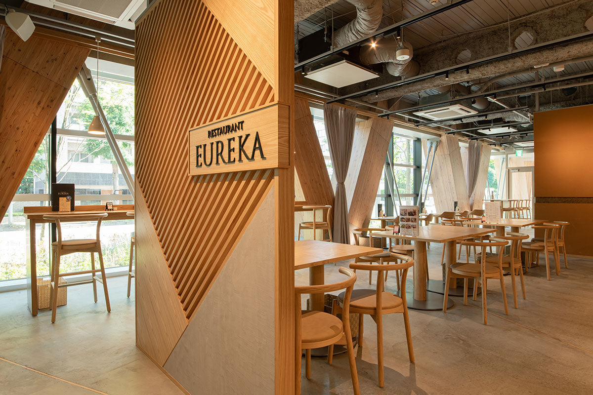 カンディハウスは、1Fホールや併設されたレストラン・カフェ「エウレカ」、2Fの大学・企業入居用個室・ラボエリアを中心に家具を納品。