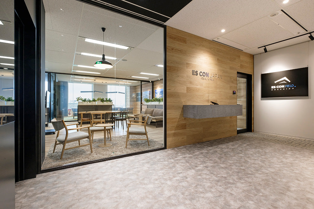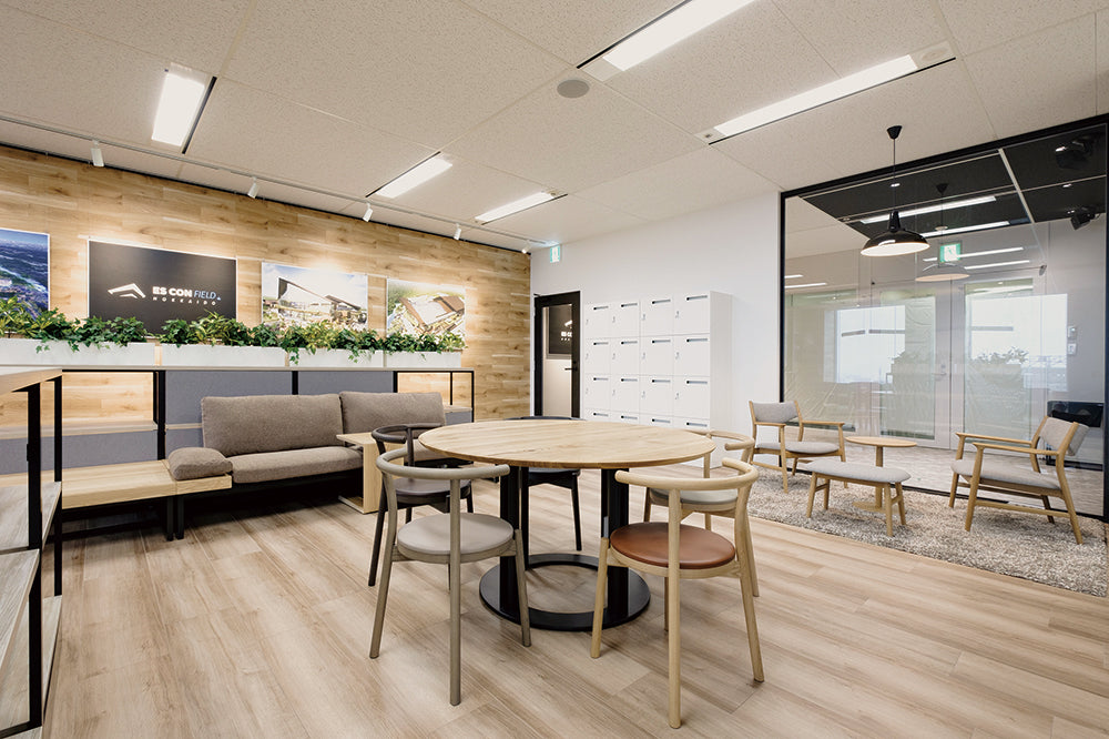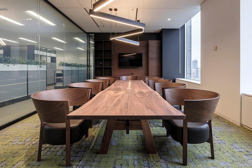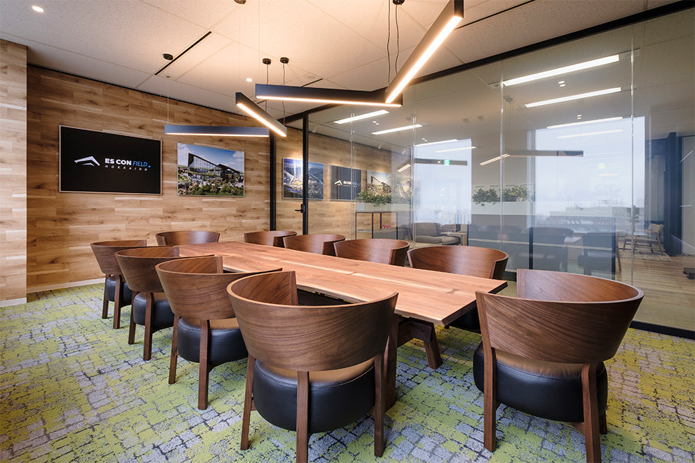 ラウンジには「RBテーブル ラウンドテーブル」や「SESTINA LUX リビング ソファー」などを配置し、「北海道産材の家具でお客さまをお迎えする」をコンセプトとしました。高級感ある応接室には、特注の「一本技 テーブル」や「am キャビネット」を施工しました。