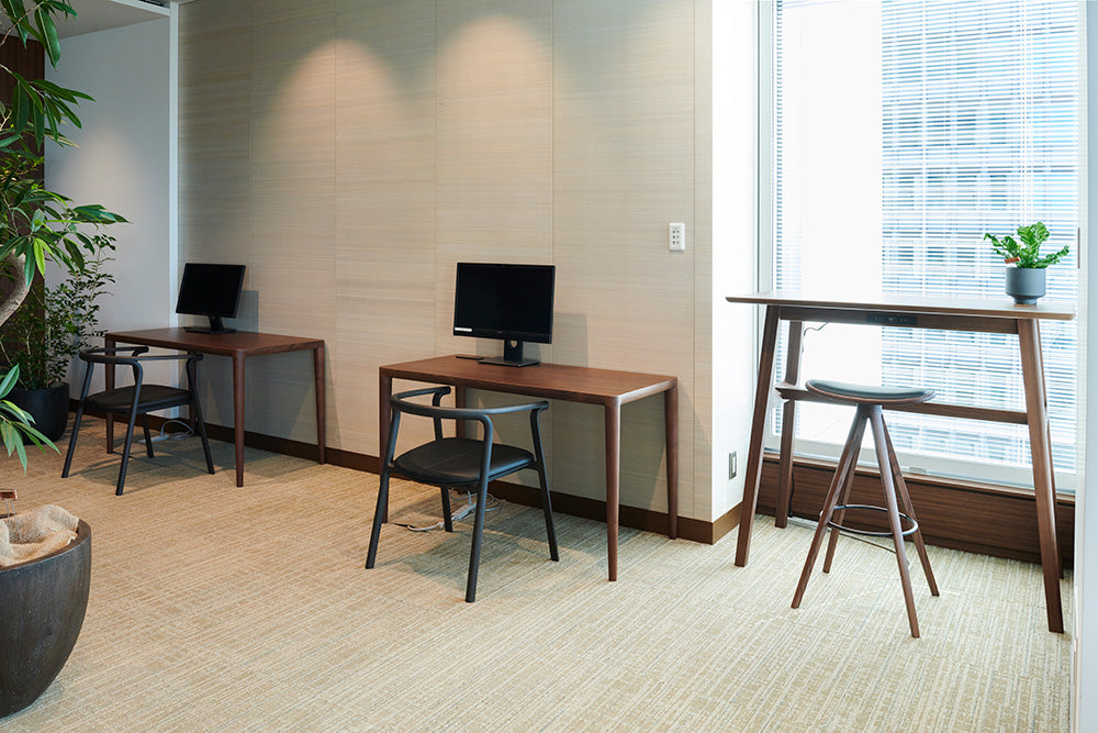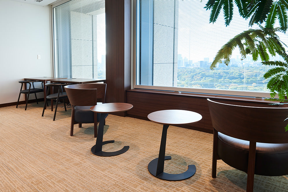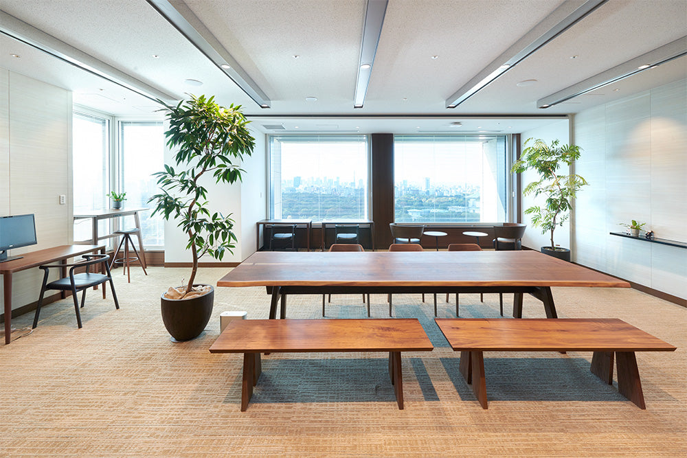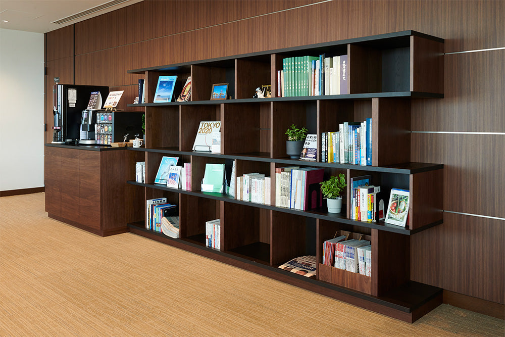 社員が役職、立場を超えて集える「リフレッシュスペース」へ。ウォルナット材の〈一本技 テーブル〉を中心に、シンプルなデザインで落ちついた色調の家具をセレクト。壁面には、資料や記念品などを見やすく展示するための家具として、新作の〈A+ シェルフ〉を導入いただきました。