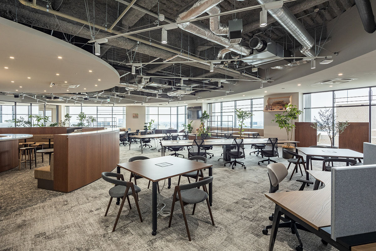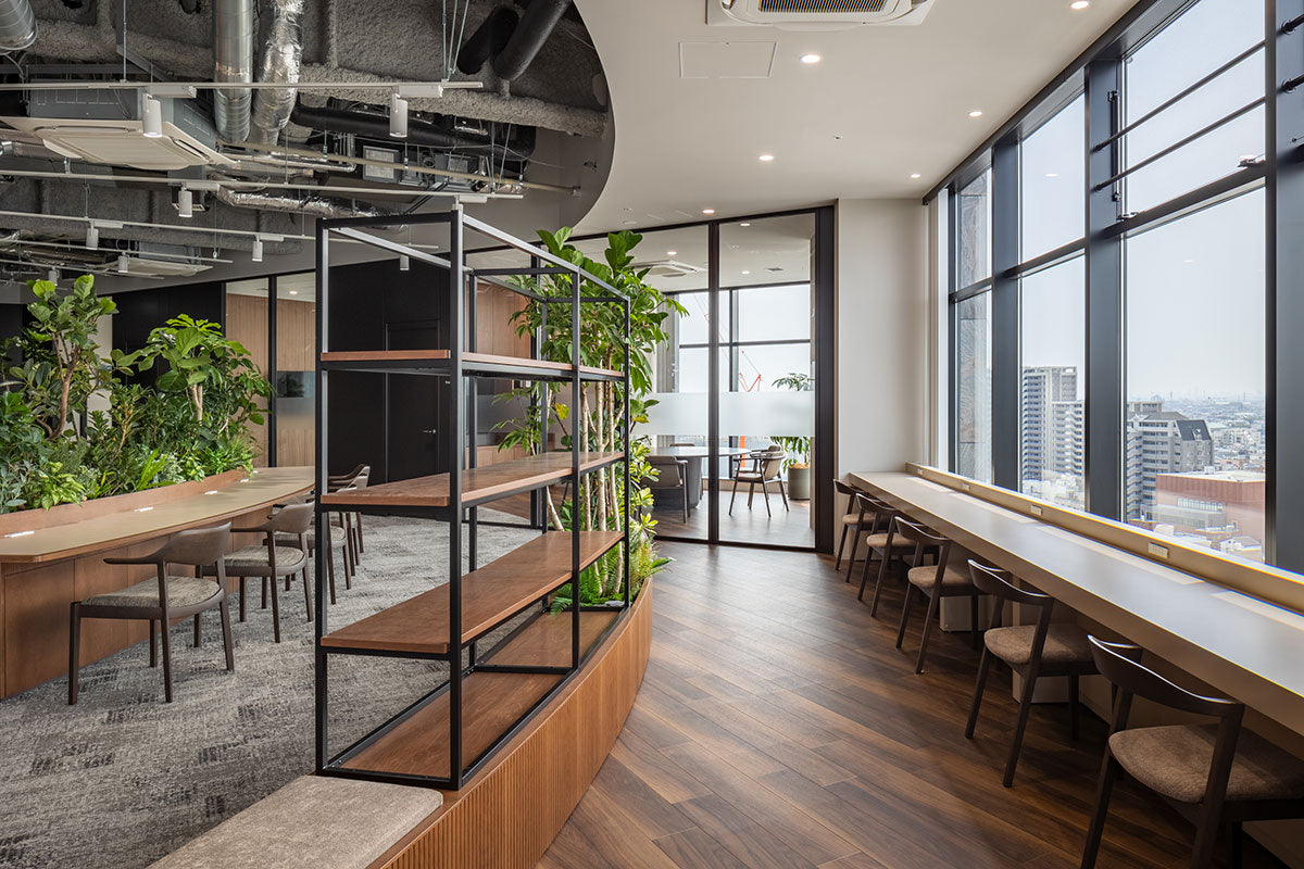 自然を感じる植物に囲まれた快適な空間づくりや、フリーアドレス席やソファースペース、ファミレスブースの導入による柔軟な働き方の実現など、社員の働きやすさを重視したオフィス設計が特長です。