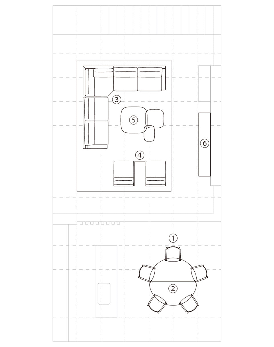 オープンキッチンと繋がるダイニングは、重厚感のある大きなラウンドテーブル<ONE LUX>を、こだわりのラインと座り心地を実現させたチェアー<EIGHT LUX>で囲み、後ろ姿にも凛々しさを感じるリッチな雰囲気を演出します。リビングにはボリューム感のあるL字型にシステムソファー<クォード リビング>を組み合わせ、大人数で集まれる充実した空間をつくります。