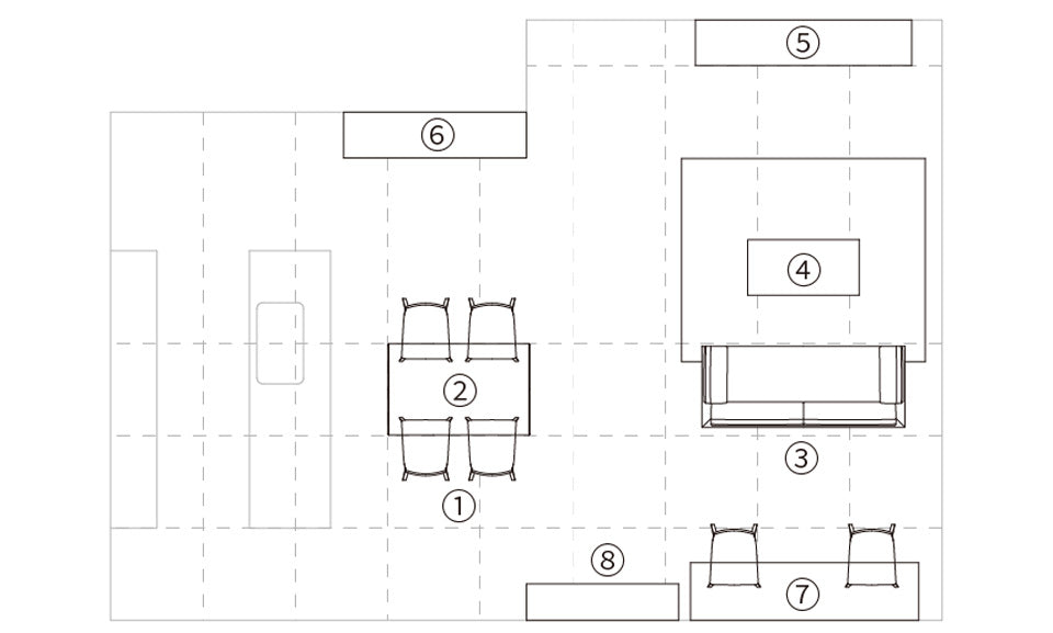 ライトグレーからダークグレーまで、全体をグレーのグラデーションでまとめたコーディネートです。シンプルでプロポーションが良い<チャレンジ ダイニング>のチェアーには、直線的なデザインのテーブル<ムーブ ダイニング>やソファー<クァイエット リビング>がマッチします。伸長式のテーブルを囲み、大人数で食事を楽しむことも。
