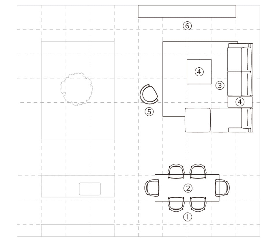 中庭と吹抜から光が射し、広く開放的な建築空間に、6人掛けのダイニングセットや、L字に組み合わせたシステムソファー<クォード リビング(15)>、壁面収納<セレクトファニチャーA+>をゆったりと配置。木部はナチュラルとグレーをミックスし、全体的にニュートラルカラーで落ち着きのある雰囲気に。好きな場所で思い思いに寛げる贅沢な空間を表現しています。