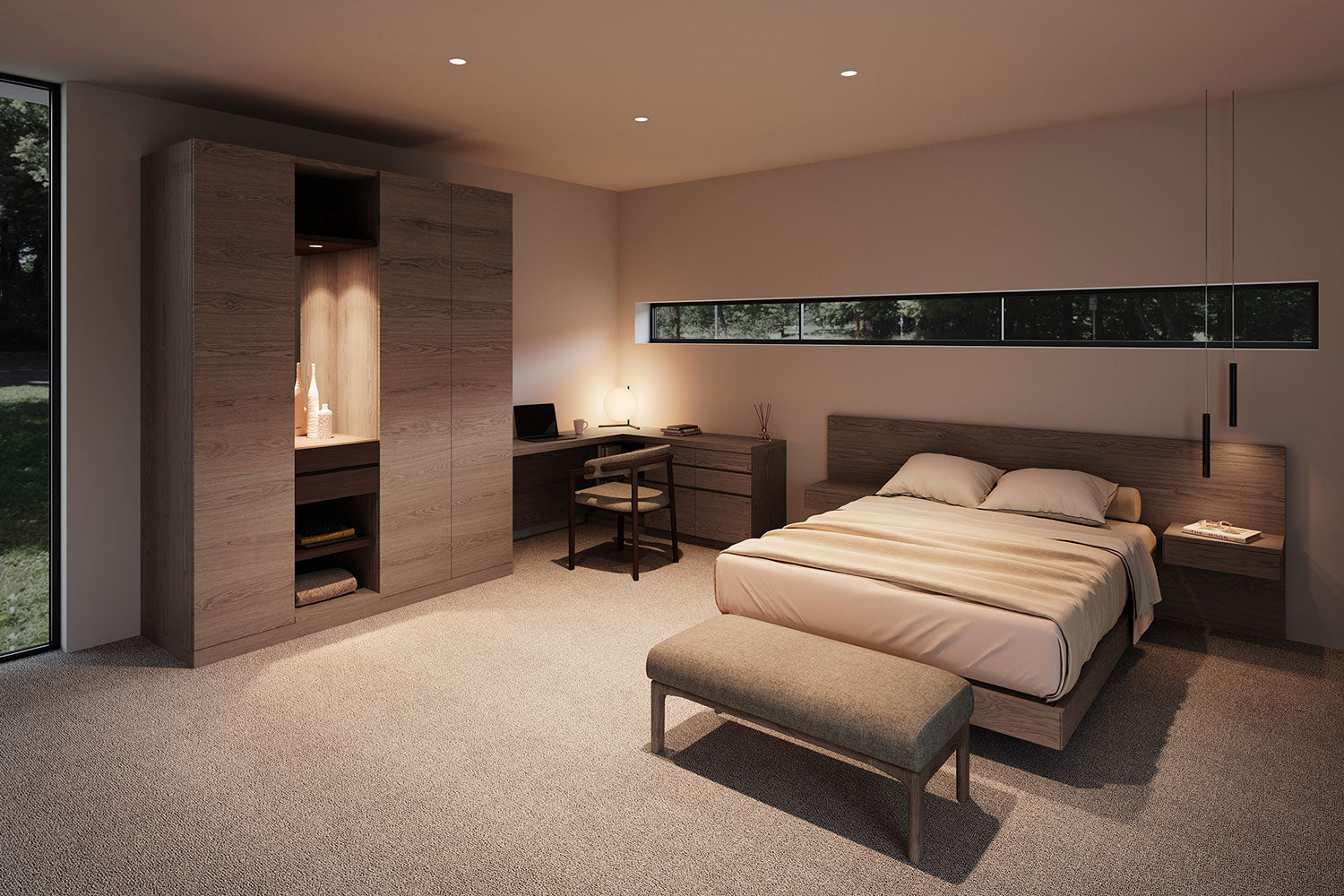 直線的でシンプルなデザインの収納家具<セレクトファニチャーA+>のワードローブとコーナーに配置できるデスク、そして<ベッドルームシステム bm(22) >のベッドフレーム。統一感のあるアイテムの組み合わせにより洗練されたベッドルームを表現します。グレイッシュな色使いにまとめることで、よりシックな雰囲気に。就寝前に落ち着いて読書をしたり、外出先から帰って一息つけるような、パーソナルな空間をつくり出します。