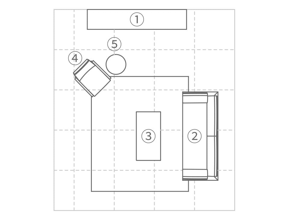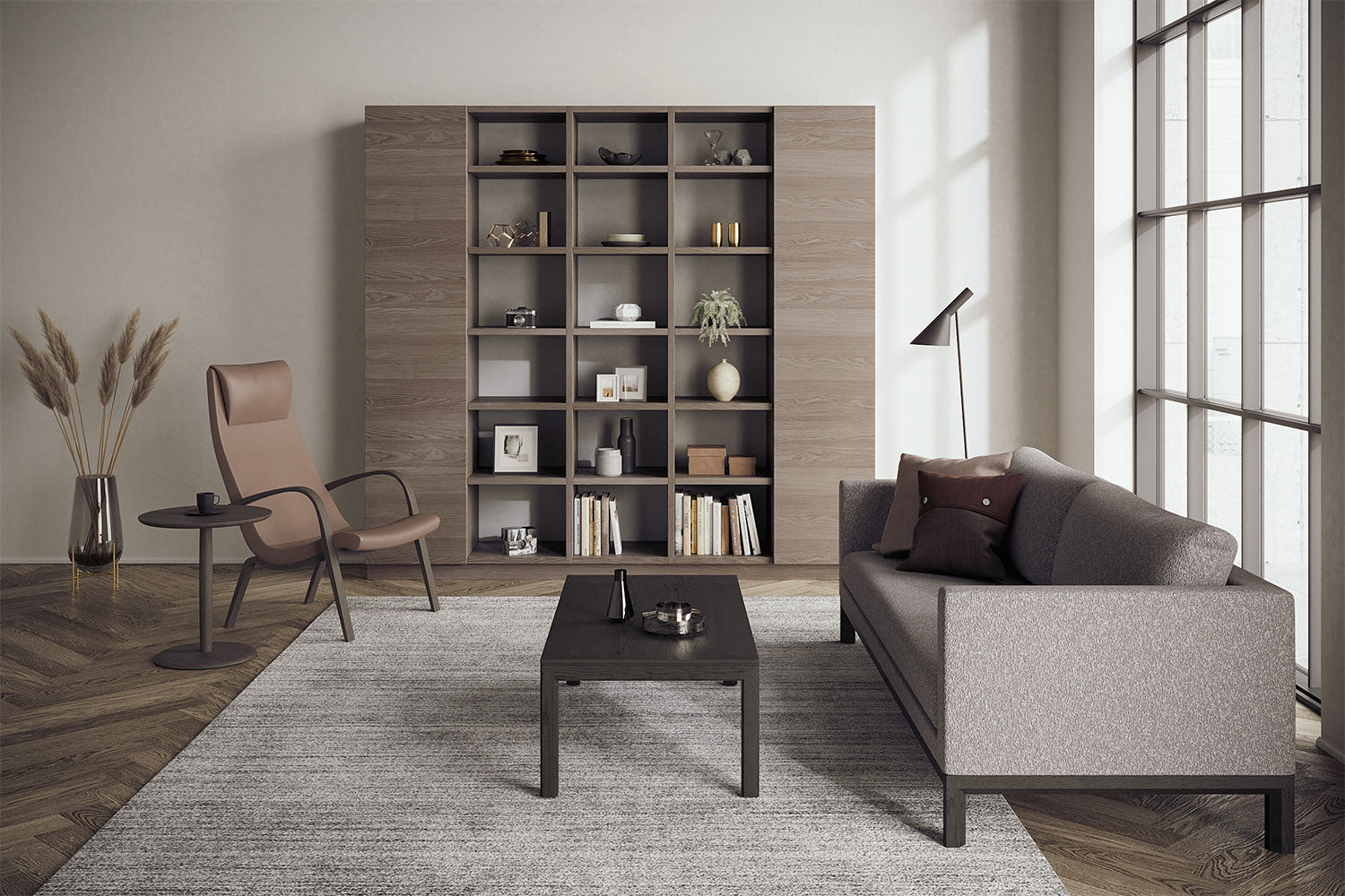 リビングは大きなブックシェルフを主役とし、お気に入りのアートや書籍、家族の写真を飾るのはいかがでしょう。直線的で等間隔なグリッドが特長のブックシェルフ<セレクトファニチャーA+>は、窓のグリッドデザインとリンクします。そこに、整ったプロポーションのソファー<クァイエット リビング>と、曲線が美しい<ライナス リビング>のハイバックチェアーをコーディネートし、少しフォーマルな雰囲気を演出。落ち着きあるリビングでくつろぎの時間を過ごせます。