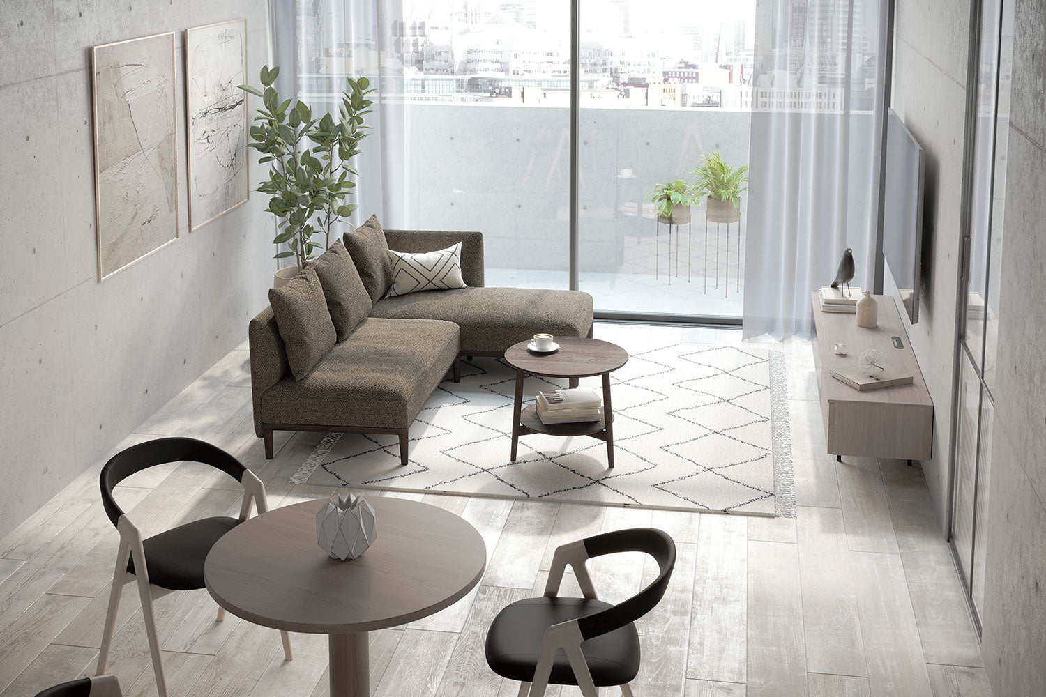 コンパクトなサイズ展開をもつシステムソファー<イコロ リビング>は、スペースに限りがあるマンションにおいてもL字に組み合わせて配置し、くつろいで過ごせるリビングを実現します。ダイニングスペースには1本脚ですっきりとしたデザインのラウンドテーブル<KOTAN>に、軽快なプロポーションの<サン ダイニング>をセットし、抜け感のあるアイテムをコーディネート。アイテム選びの工夫で、圧迫感を感じさせない快適なリビングダイニングをつくり出します。