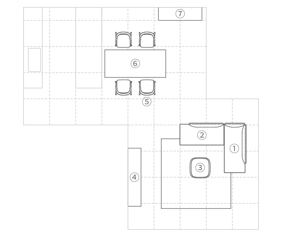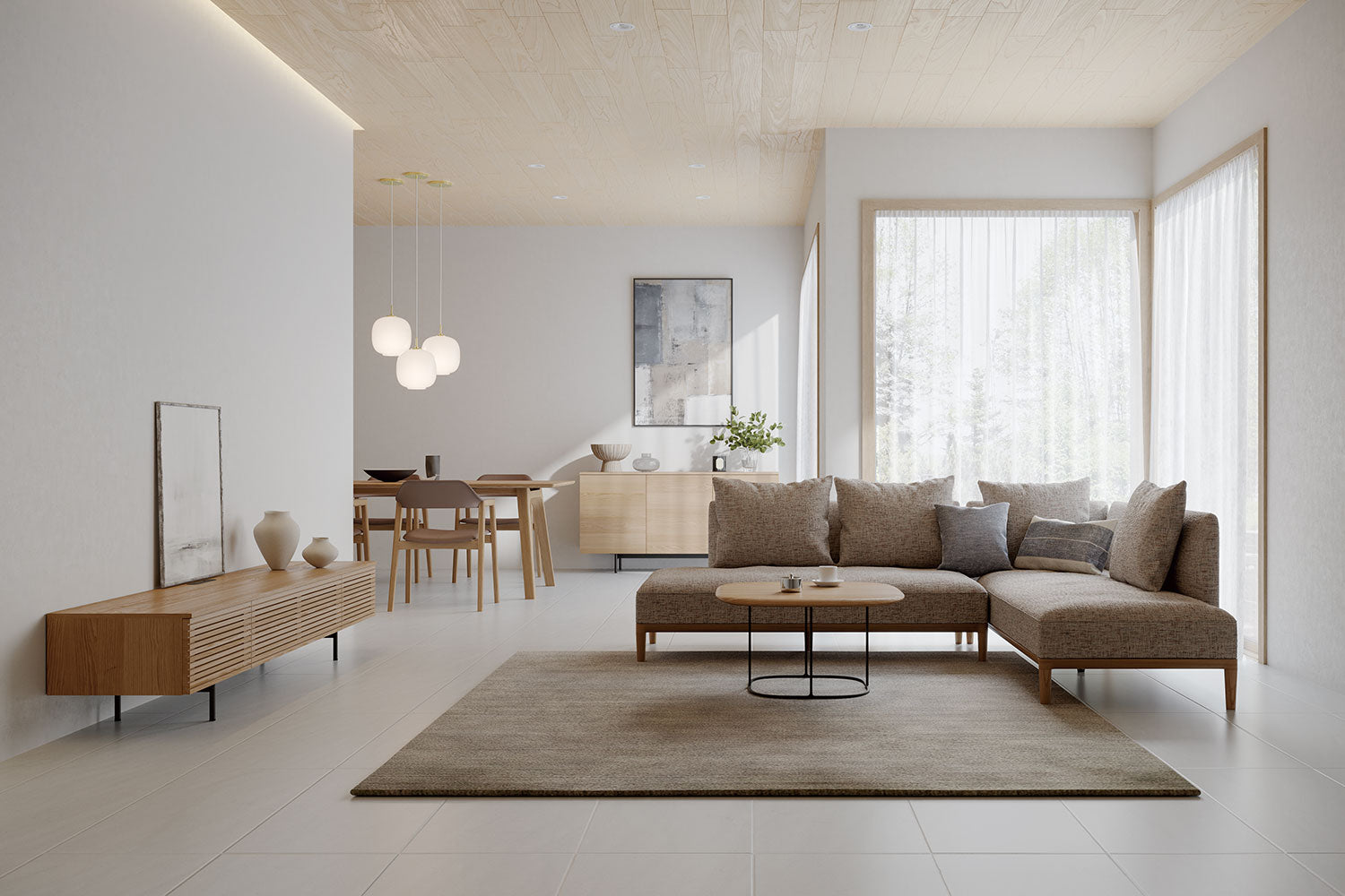 コンパクトなサイズ感ながらも、狭さを感じさせない座り心地のシステムソファー<イコロ リビング>をL字に配置したリビング。シンプルな丸テーパー脚の雰囲気に合わせ、テーブル<テン リビング>や、収納家具<セレクトファニチャーA+>は金属脚で浮遊感のあるデザインをコーディネートしました。全体的にアースカラーを用いた淡い色使いで、優しい印象にまとめています。好みのアートや陶器、お花を飾ることを楽しめる空間です。