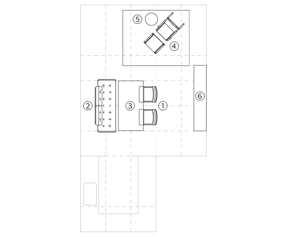 スペースを広く有効に使うため、ソファーと食卓を兼用できるリビングダイニングセット〈アルプ LD〉と、景色を望む窓際にはしっかりと寛いで座れるロッキングチェアー〈ソリ ロッカー〉を配置。スライドドアキャビネット〈セレクトファニチャーA+〉は、テレビを見ない時にはモニターを扉で隠せるのがポイントで、お部屋をスッキリと見せます。好きな本を収納したり、アートオブジェを飾って楽しむことができます。