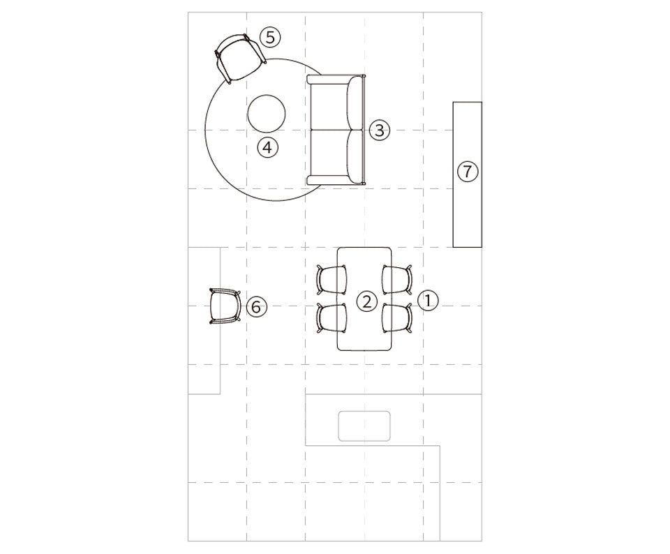 ナチュラルな内装に、家具はダークグレーで揃え、アクセントカラーにオレンジを取り入れた遊び心のあるカジュアルな雰囲気のリビングダイニング。クラフト感が漂うダイニングセット<コレント ダイニング>と、リビングには二人掛けのソファー<YUKAR リビング>とパーソナルチェアー<KAMUY リビング>を組み合わせ、コンパクトながら必要十分なサイズ感で、家族が集まって寛げる空間をつくり出します。