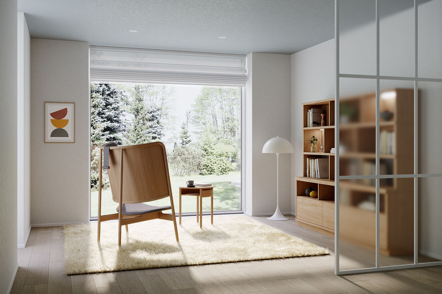 体を包み込むようなデザインのイージーチェアー<フラン リビング>と、好きな本をたくさん収納できるブックシェルフ<セレクトファニチャーA+>を配置することで、贅沢なパーソナル空間を演出します。イージーチェアーに腰かけ、読書や音楽など趣味に没頭したり、窓外の景色を見て休息したり、自分だけの時間を過ごせます。インテリアエレメントや飾る小物のカラーコーディネートでカジュアルな雰囲気に。