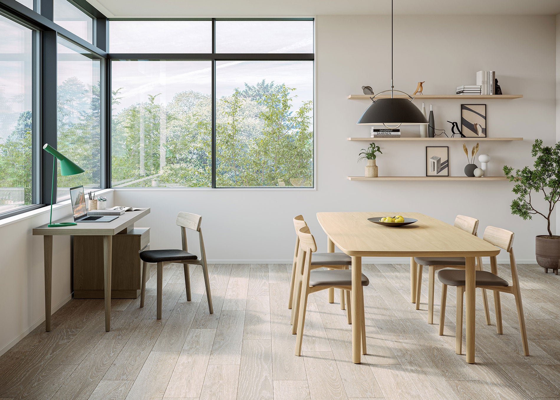 「必要なものだけを残した」とフィンランドのデザイナー、アンティ・コティライネン氏が語る「AATOS[アートス]」。フィンランド語で「崇高な考え」を意味するこのスタッキングチェアーは、軽快かつ堅牢で、コントラクトにも対応する汎用性の高さが特長です。同じくスタッキング機能を持たせたハイチェアーは、市場でも木製は稀な存在。北海道産ナラ材で表現した背と脚のフォルムが、後ろ姿の美しさを際立たせています。