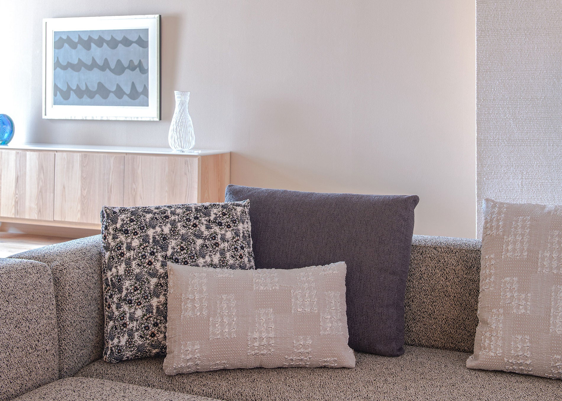 暮らしのさまざまなシーンでくつろぎ感を高めてくれるクッションのラインアップ。花をイメージした質感と立体感が魅力の「K」タイプは、北海道出身のテキスタイルデザイナー梶原加奈子氏が手掛けています。そのほか、レザーのはぎれを有効利用した革クッションなど豊富な種類を揃えています。