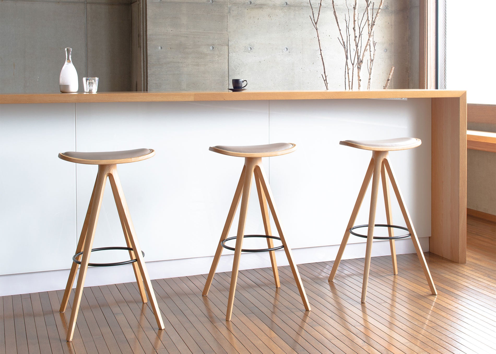 デンマーク人デザイナー、マイケル・ポールセン氏が自ら「Be Seated(どうぞお掛けください)」と名付けたハイスツール。馬の鞍をイメージさせる座と、そこからきれいに伸びる4本の脚を、北海道産タモ材の表情豊かな木目が引き立てています。商業空間のカウンターはもちろん、住宅の対面式キッチンに合わせても。