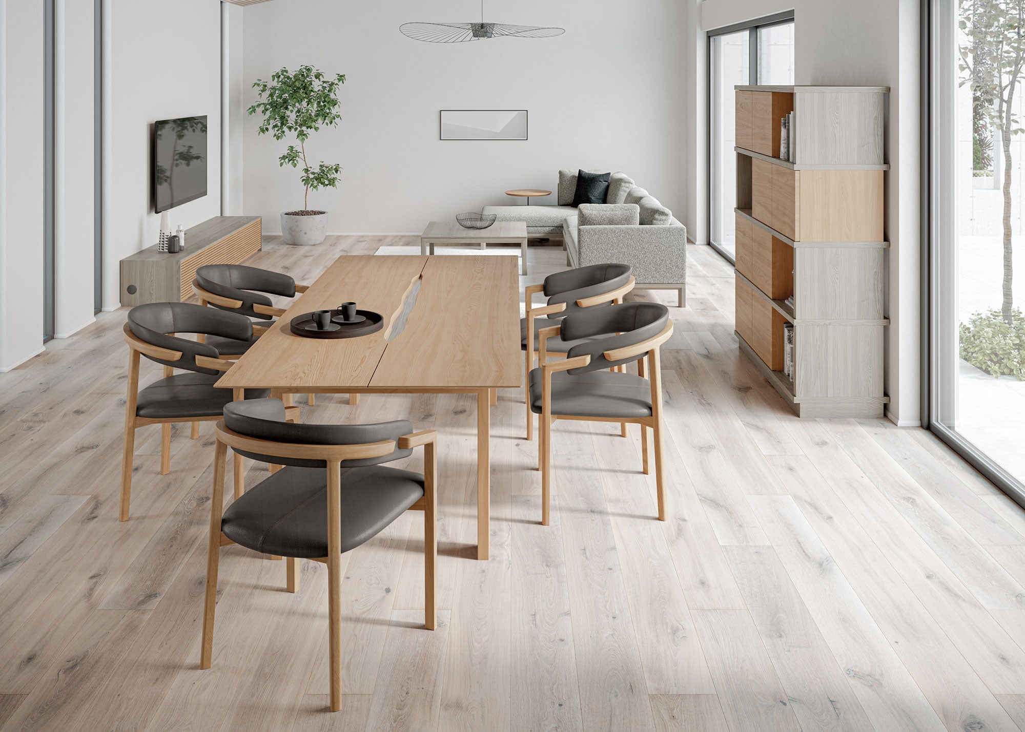 「渓谷(canyon)」の造形をテーブル中央に施しました。厚さ25mmの無垢材を、縁から中心へ大きく斜めにカットして薄く見せる一方、渓谷部分を深く彫り込むことで天板の厚みを表現。また、ステンレス材で脚とジョイントされた天板の浮遊感も魅力です。