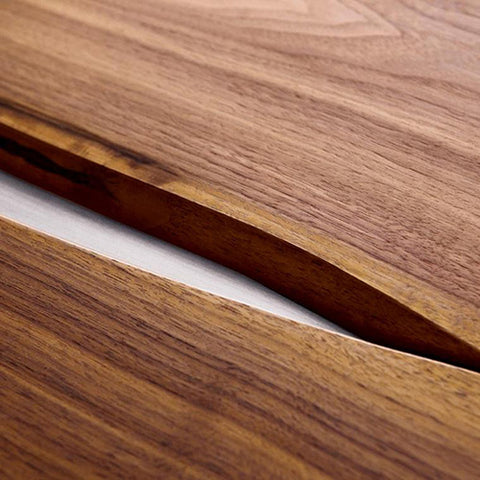 「渓谷(canyon)」の造形をテーブル中央に施しました。厚さ25mmの無垢材を、縁から中心へ大きく斜めにカットして薄く見せる一方、渓谷部分を深く彫り込むことで天板の厚みを表現。また、ステンレス材で脚とジョイントされた天板の浮遊感も魅力です。