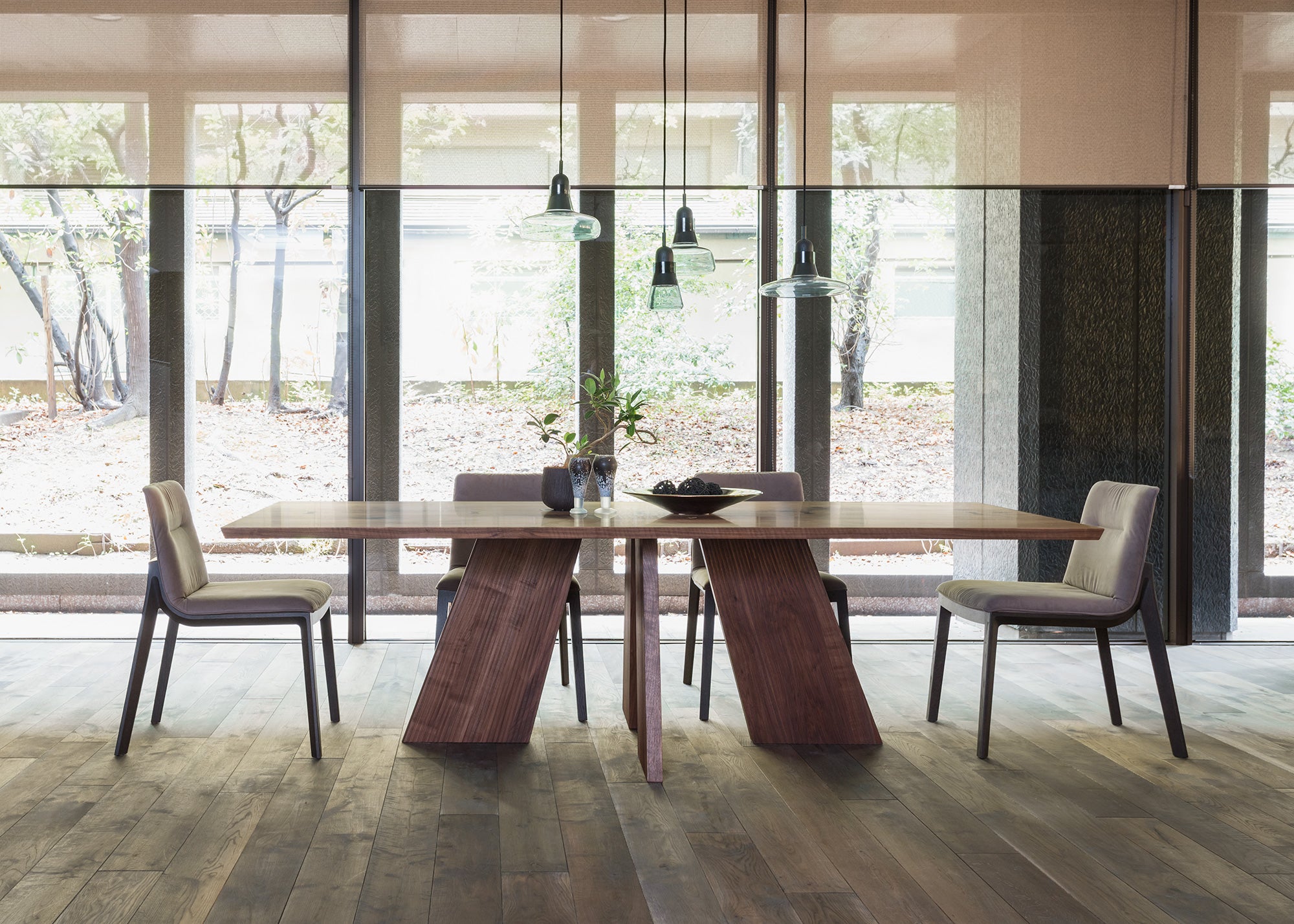 堂々と立つ武士の「袴」姿から発想した、凛とした力強いデザインが特長です。脚部は、袴の折り目をイメージした美しい波模様。下へいくほど溝を太く彫り込んで末広がりの形状を自然に表現しています。テーブルは長方形と円形の2種類。ベンチはテーブルと組み合わせるだけでなく単体で置いたり、ホールなどの大空間に並べると存在感を発揮します。