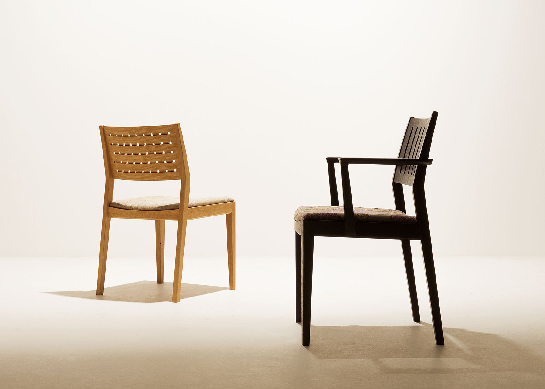 デザイナー三井緑さんの暮らし手としての発想を基本に、掛け心地、美しさ、軽さ、強度など、椅子に求められるさまざまな条件を満たした定番製品。これまで店舗や福祉施設といった多くの公共空間に採用されています。季節ごとの光や匂いを室内に取り込むという創意から生まれた、格子の意匠が個性的。