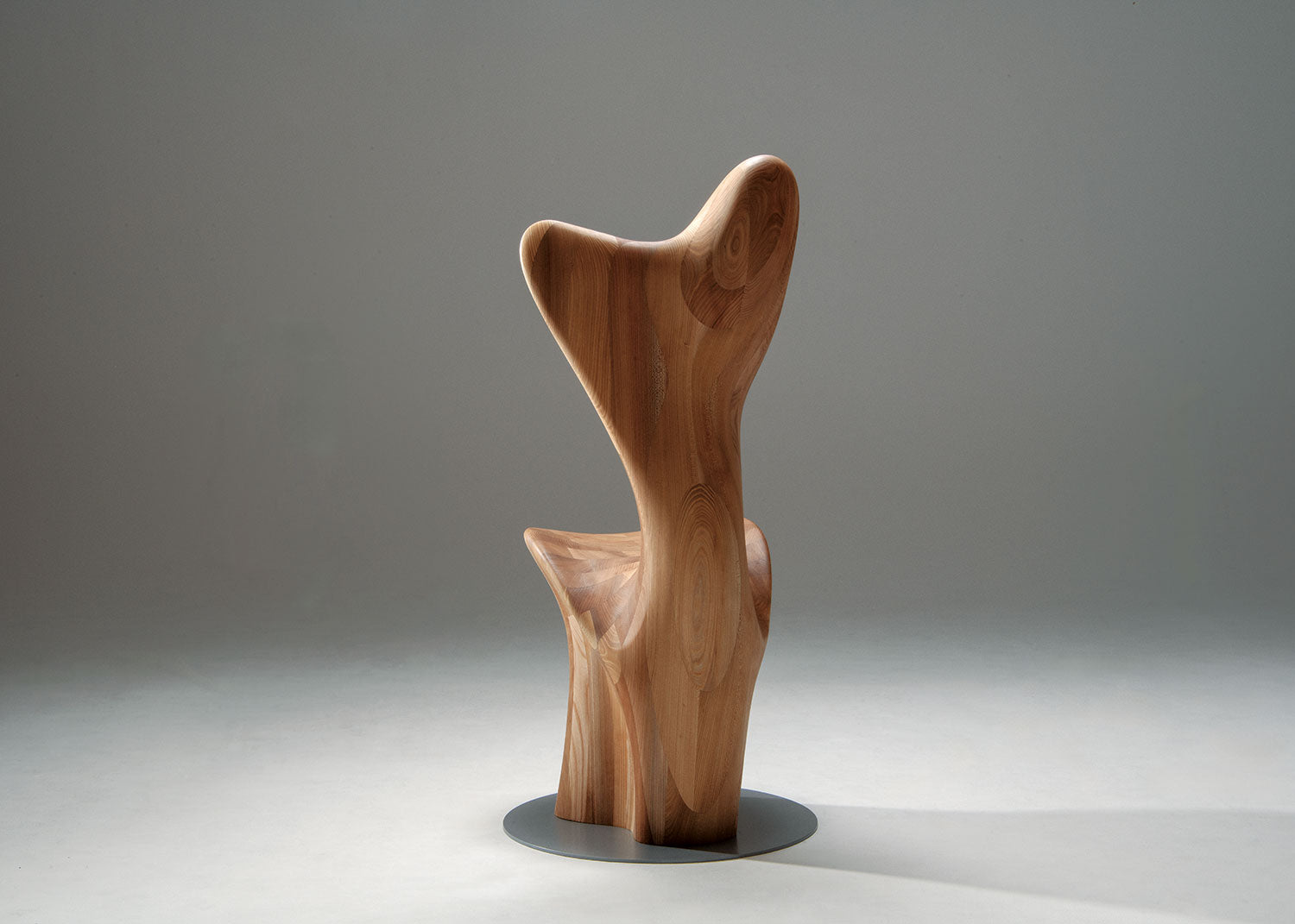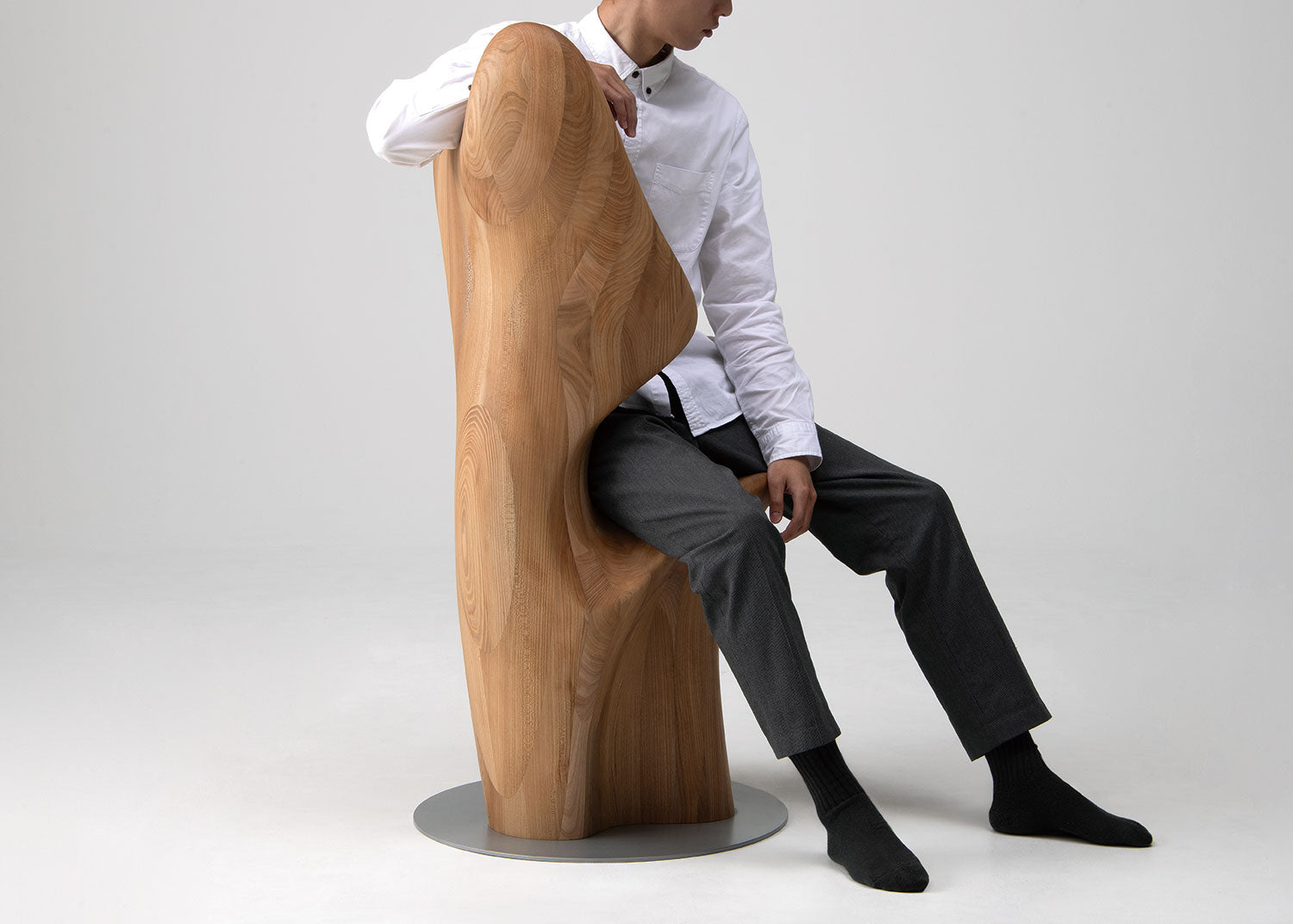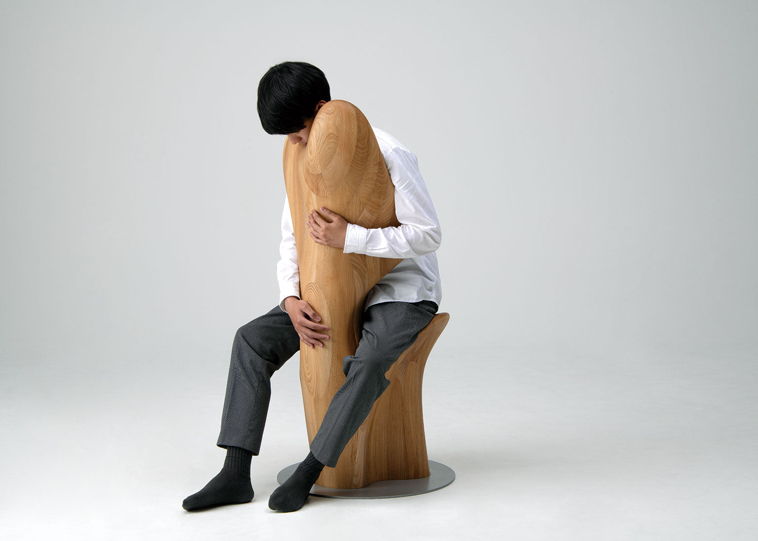 「国際家具デザインコンペティション旭川[IFDA]2024」のゴールドリーフ賞を製品化した「ハグチェアー」は、その名の通り、抱くように座る椅子です。誰もがひと目で惹きつけられるこのフォルムは、中国のデザイナーのシュ・ユコウ(朱禹豪)氏によるもの。「木製家具と人々との間により親密な関係を築く手段として、どんな体型どんな姿勢の人もあたたかく迎え入れるような椅子をデザインした」と話します。カンディハウスはその新しさと力強さに「世界へ発信できる」と直感し、この極めて有機的な形を北海道産ニレ材で再現しました。手触りがやさしいオイル仕上げで、座る人をほかのどの椅子にもない心地よさで包み込みます。商業施設や公共空間、ホールやオフィスに一脚あるだけで、その場を一瞬にして不思議でユニークな空間に変えてしまうことでしょう。