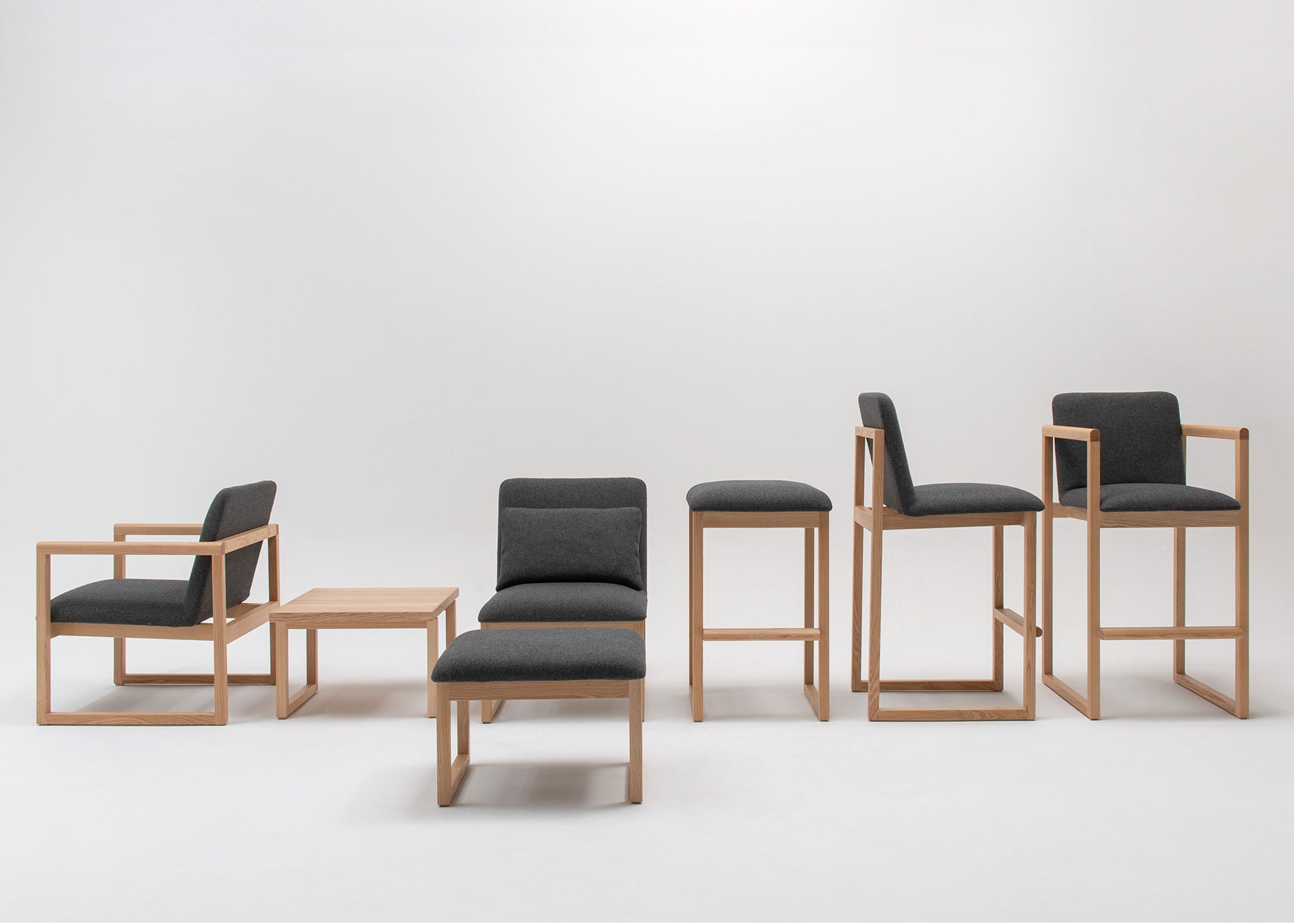 ほどよい太さのある水平垂直な木部フレームが、和の落ち着きを感じさせる椅子とテーブル。トネリコの米谷ひろし氏が、建築に溶け込む家具としてデザインしたリビングアイテムです。「座布団のような無造作感(米谷氏)」を表現したクッション部は、モールド発泡ウレタンを併用して腰掛ける人の体をやさしく受け止める仕上がりに。ソファーとは異なるパーソナルなくつろぎが生まれ、ホテルや応接室など長時間過ごす場面にも対応します。