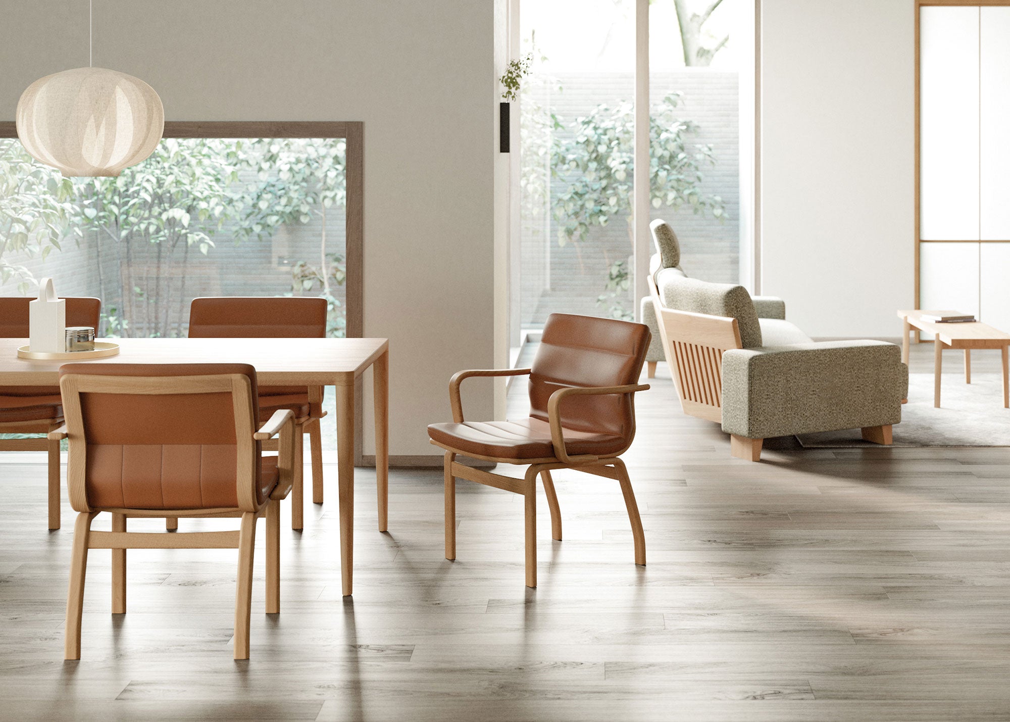 ベーシックな中に工芸的な味わいあふれるロングセラー。座から背にかけてボリュームを抑えたクッションを張り込み、安楽性を高めています。木部の有機的なカーブは、腰掛けた人の姿を美しく見せる効果も。北欧のモダンデザインと日本の木工技術が融合した贅沢な一脚。