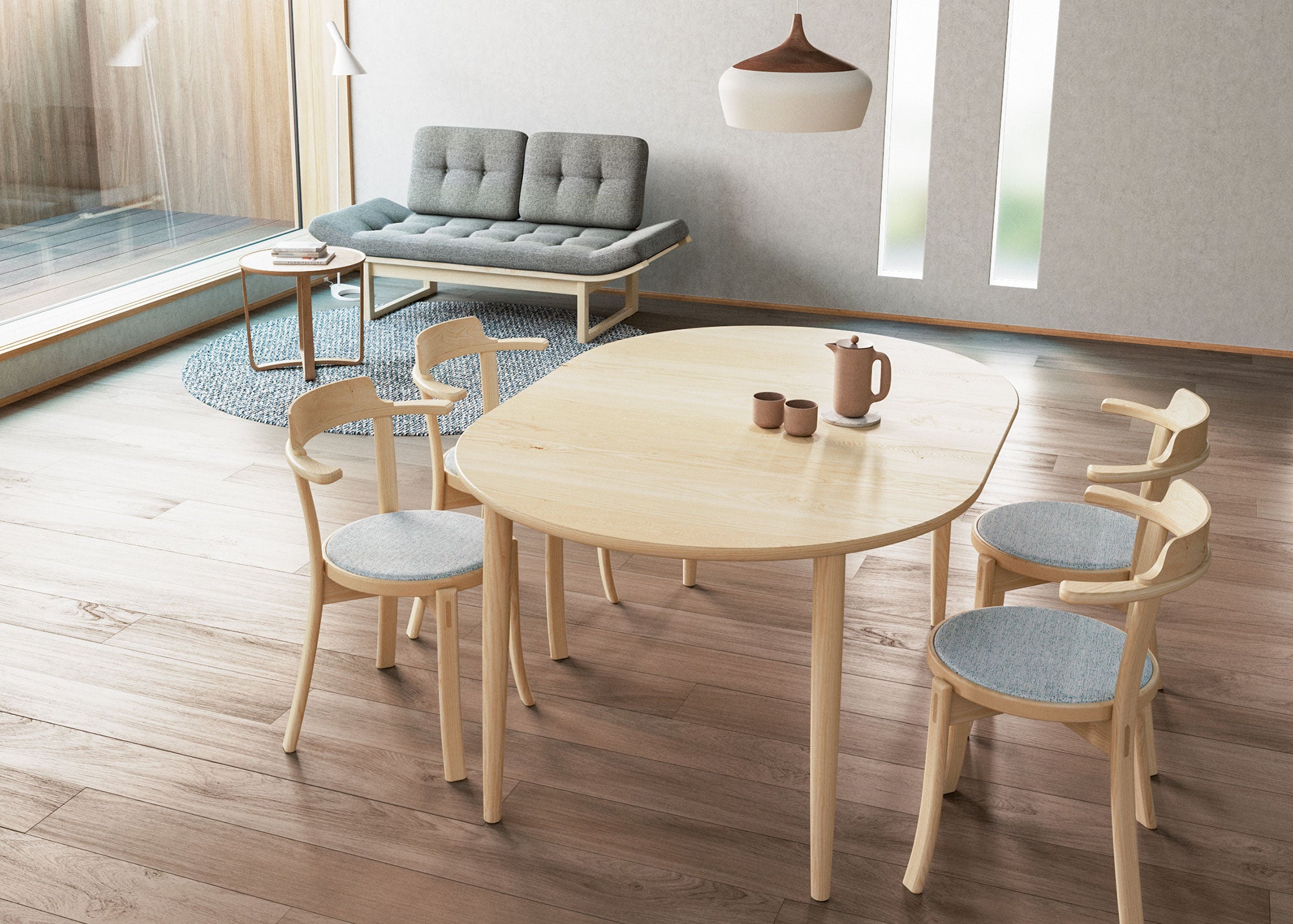 バタフライ式に収納された天板を、簡単な操作で広げられるエクステンションテーブルは、用途やスペースに合わせて500mm伸長。シンプルなデザインは椅子や空間を選ばず、コンパクトなときもワイドに使っても美しい姿はそのままです。北海道ニレ、北海道タモ、北海道サクラ、北海道ナラ、ウォルナットに数種類の塗装から選んでお気に入りの場所をつくってください。