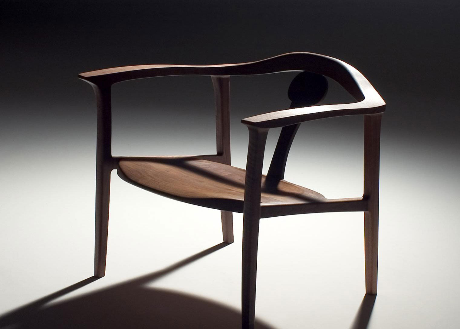 彫刻家 流 政之が手がけた、初めての家具です。自らプロトタイプを制作し、旭川の家具メーカーと共に開発をスタートしたのが2005年10月。ふつうの家具のような常識的なラインを一切持たない、「基準のない椅子」を前に、芸術作品をプロダクトにする作業が半年間続きました。特に、背もたれから肘にかけての線はなめらかになりすぎないよう細心の注意を払い、座枠と前脚には美しい緊張感を持たせるため、光と影がつくる“稜線”を際立たせています。