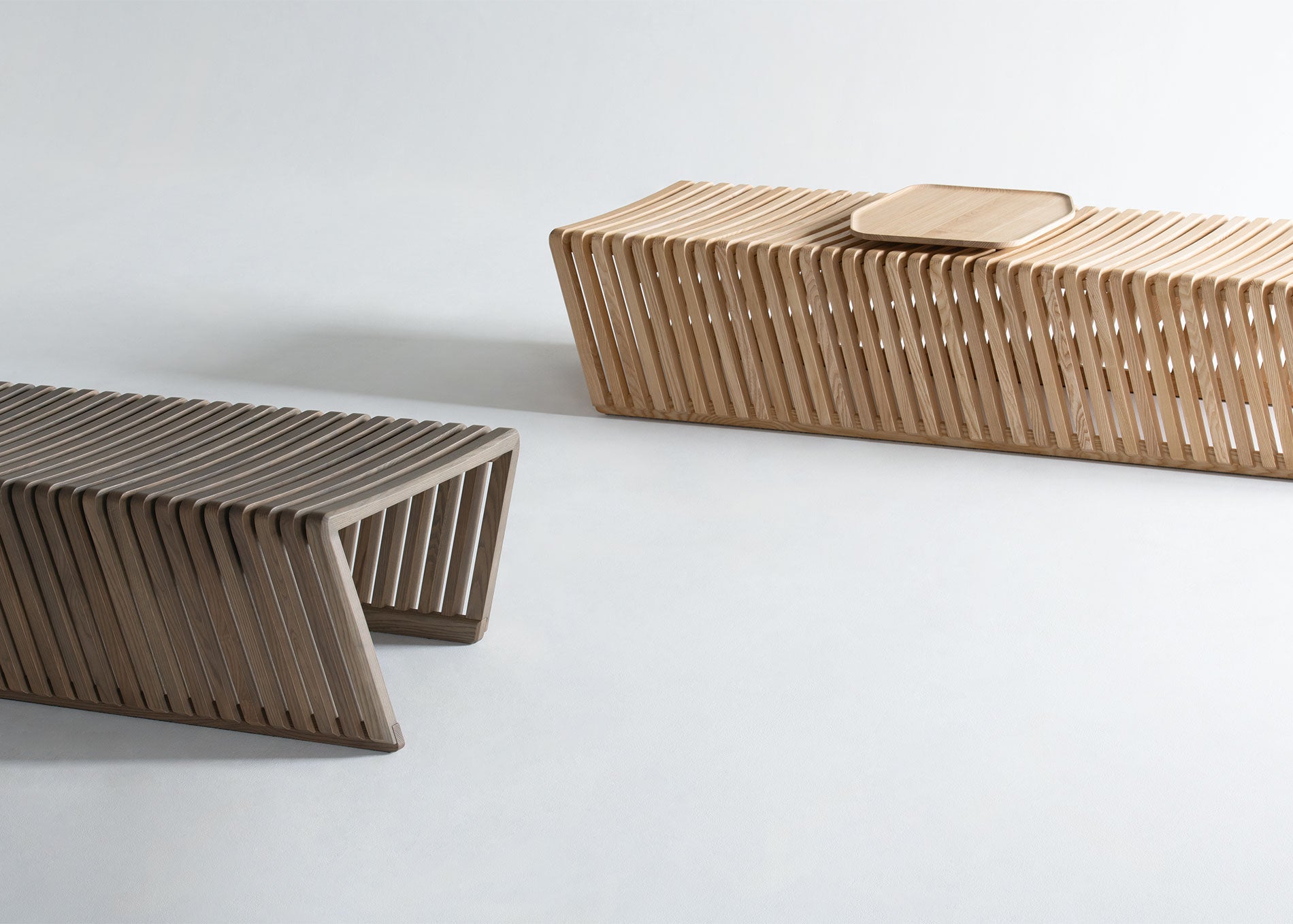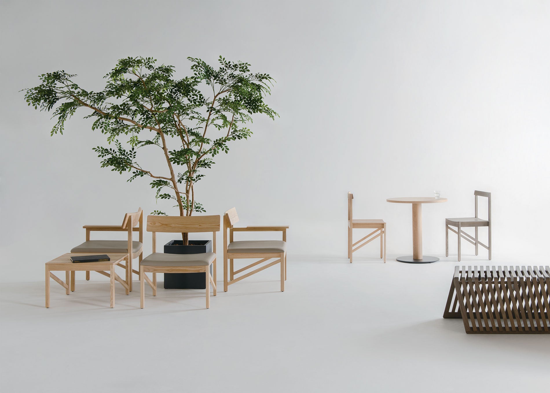 NAKKA [ ナッカ] シリーズは、デザイナーの藤森泰司氏により、2022 年にオープンした「大阪中之島美術館」の ためにデザインされました。象徴であるベンチを中心にソファーベンチやイージーチェアーなど、各アイテムに現 れる中之島の“N” の文字が、シリーズのデザインモチーフとなっています。天然素材の柔らかな質感で、近くから でも遠くからでも印象に残る木製の線材で表現しています。