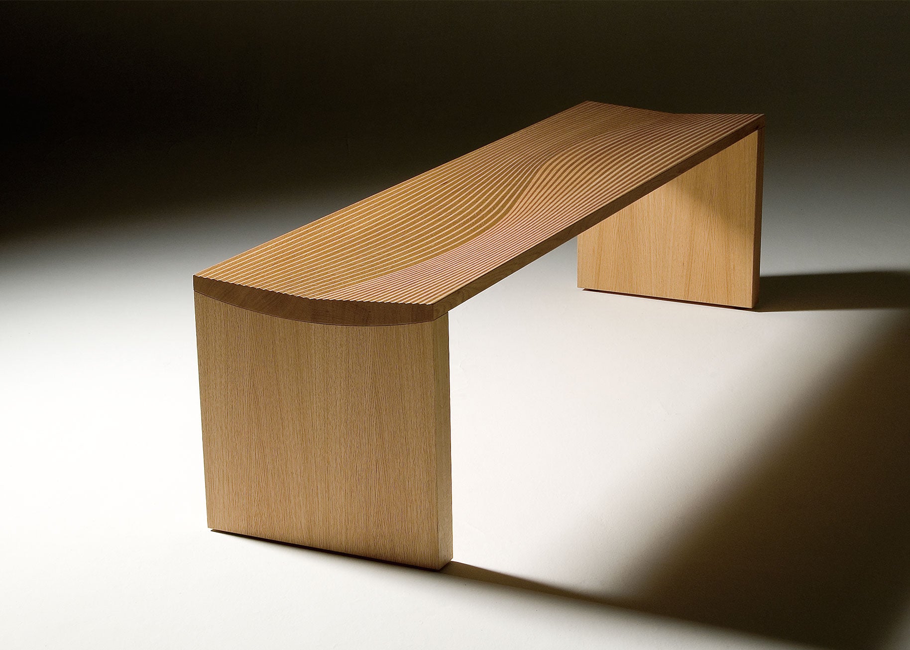 凛とした佇まいのベンチは、「国際家具デザインコンペティション旭川 2005」の入選作品からの製品化。あえて木口をそのまま見せた無垢材の力強さと、座面に描かれた繊細な波模様の対比は、石で水や自然を表現した枯山水を彷彿とさせます。