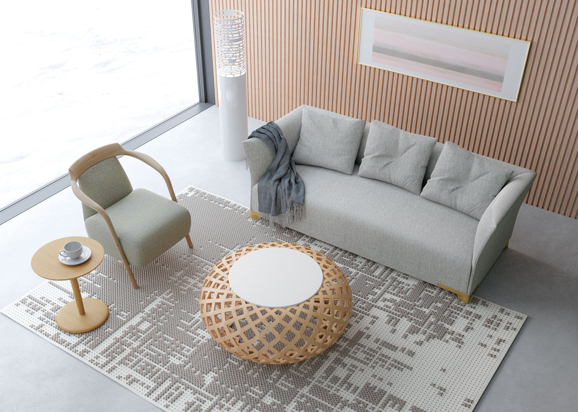 長い時間スマホを使って過ごす、現代のライフスタイルに対応する安楽性と機能を両立したリビングアイテムです。無段階リクライニングチェアーの、北海道産ナラ材のテーブルがそれを象徴。たっぷり厚い背と座が安心感を与えるラウンジチェアーと、和を感じさせる工芸的な仕上がりのサイドテーブルを合わせても。