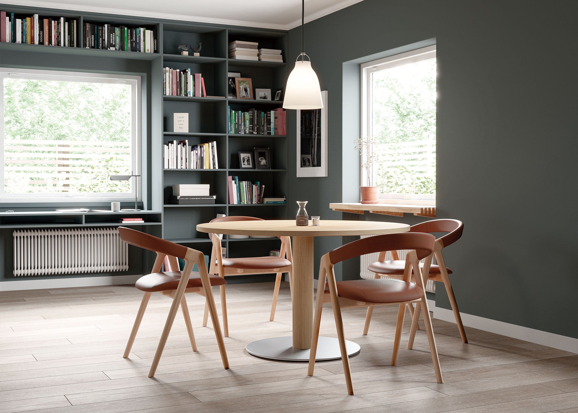 A字に伸びた長い脚と背は、3本の線で描いたスケッチからの発想。腰掛けたとき、張り仕様の背からアームへ心地よく体をもたせかけられ、オフィスやカフェ、長時間過ごす個人宅のダイニングなどでも身軽に活躍します。北海道カバのさらりとした手触りが心地よく、革張りではクラフト感のあるステッチワークが知的なアクセントに。