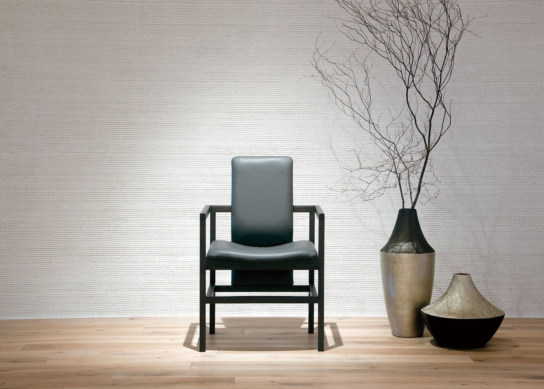 川上元美氏が「緊張感のあるくつろぎ」を表現した「SETTE(セッテ)」は、どこか和を感じさせる建築的なデザイン。シンプルな構造ながら、人の体を受け止める背と座はやさしい曲面を描きます。「親しみがあり、どこかつややか」と川上氏。十分な座幅、細いフレームと高い背のバランスが、特に後ろ姿を美しく見せ、フォーマルなシーンを演出。肘と同じ高さのサイドテーブルと組み合わせて、横並びや互い違いなどさまざまな置き方で集いの場を構成できます。ホテルやオフィスのロビー、バーなどでも軽やかな上質感で空間を彩ります。