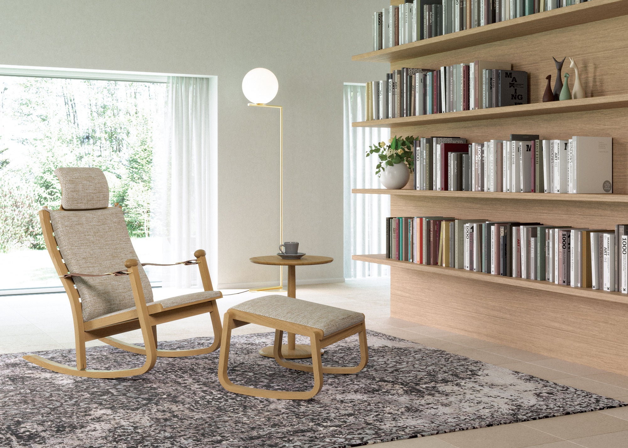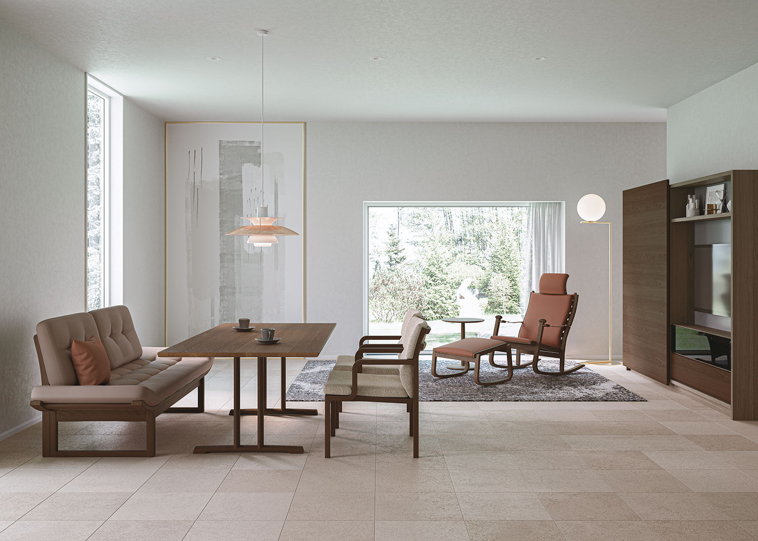「国際家具デザインコンペティション旭川 1993」の受賞作品を製品化。リビング空間を軽快に移動する「橇(ソリ)」をイメージしました。肘掛けベルトは、 両手で上から押すことで立ち上がり動作を助けるほか、座ったままでも背の角度を5段階に調節できるなど多機能。心地よい揺れを計算したうえ、アームの握りなどユニークな意匠もプラスしました。