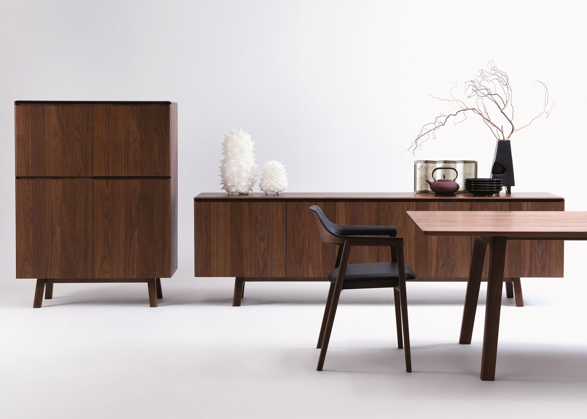 天板の縁や扉の引き手まわりなどに、デザイナーのこだわりと緻密な技術が生きています。背面仕上げに加えて無垢やカラーの天板が選べ、ディスプレイやおもてなしにも活躍。また大画面・薄型化するテレビとバランスのよい、コンパクトで浮遊感のあるテレビボードが加わりました。背面が開き煩雑なコードがすっきり収まる設計です。