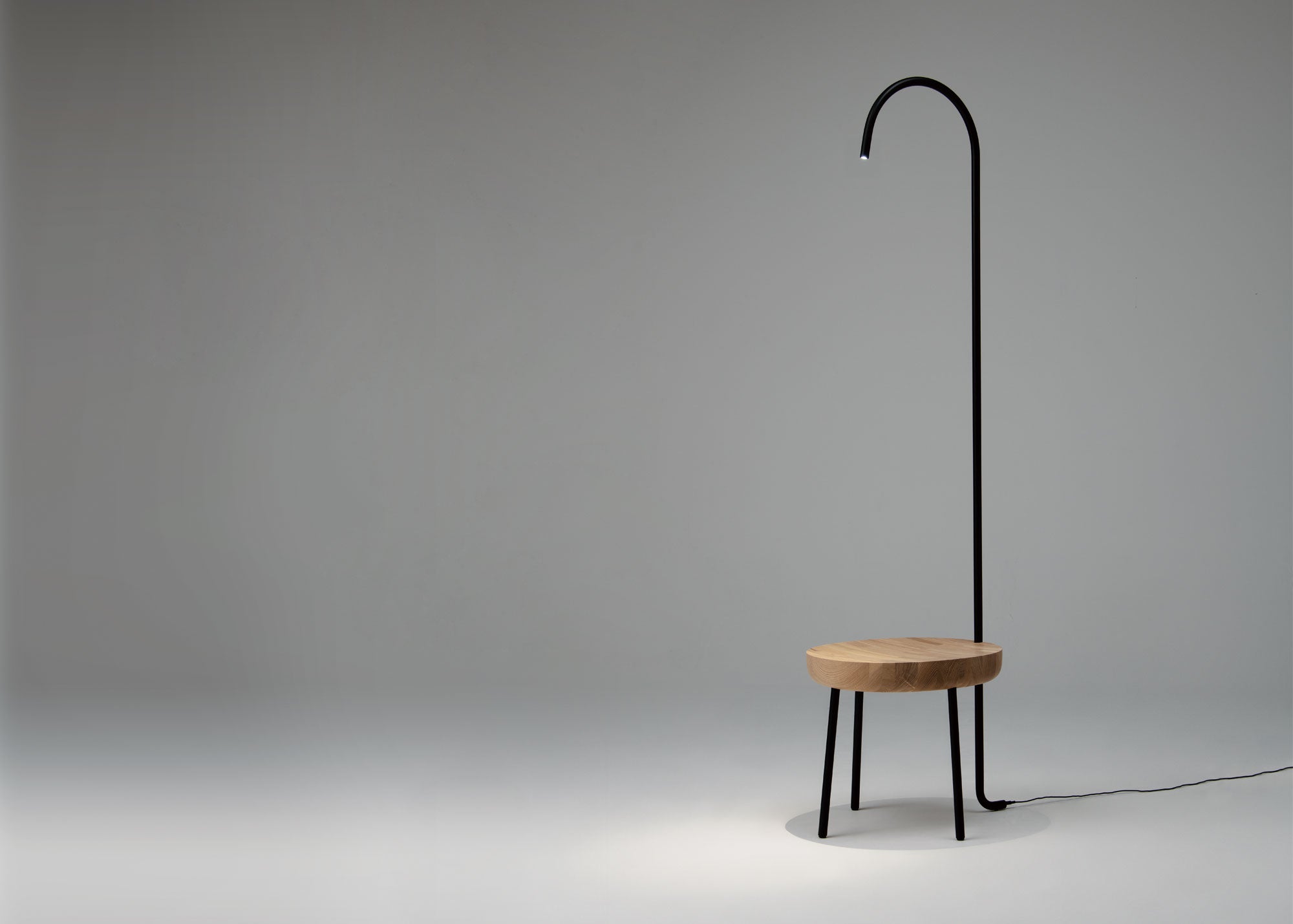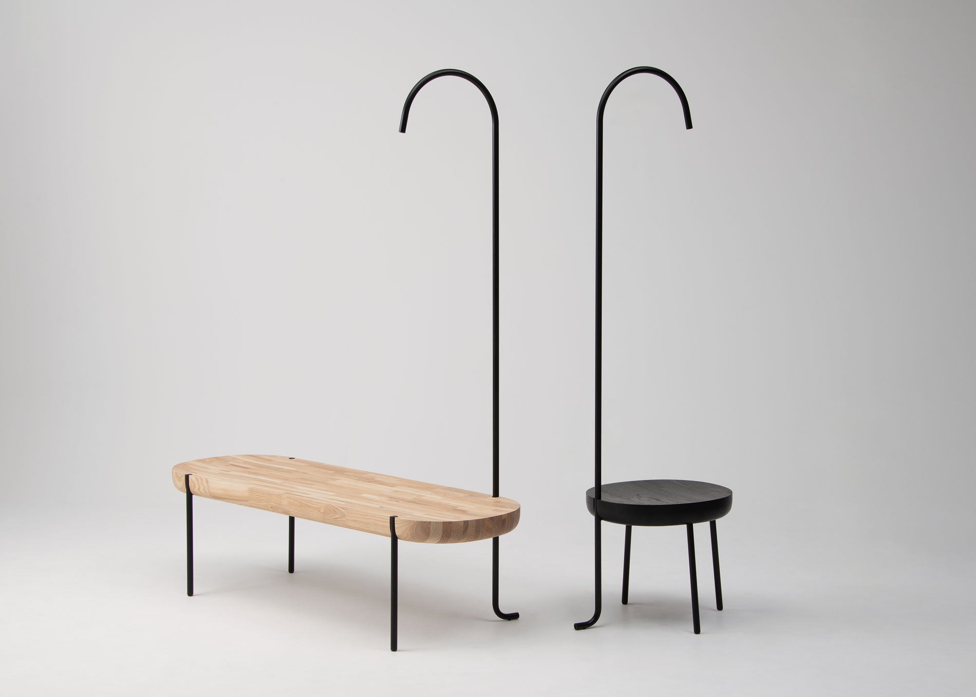 大胆なボリュームの木座と、細いパイプ状の脚のコントラストが印象的なスツール&ベンチです。北海道産タモ材の座は、家具の製造過程でできる端材を活用した集成材。木目や色に配慮してていねいに繋ぎ合わせることで豊かな表情が生まれました。後ろ脚が照明になったスツールは「国際家具デザインコンペティション旭川[IFDA]2021」の入選作。2サイズ展開のベンチは、オプションでテーブルやリーディングライトとの組み合わせも選べます。ギャラリーやホテルのラウンジなど、人々が集うシーンで活躍するシリーズです。