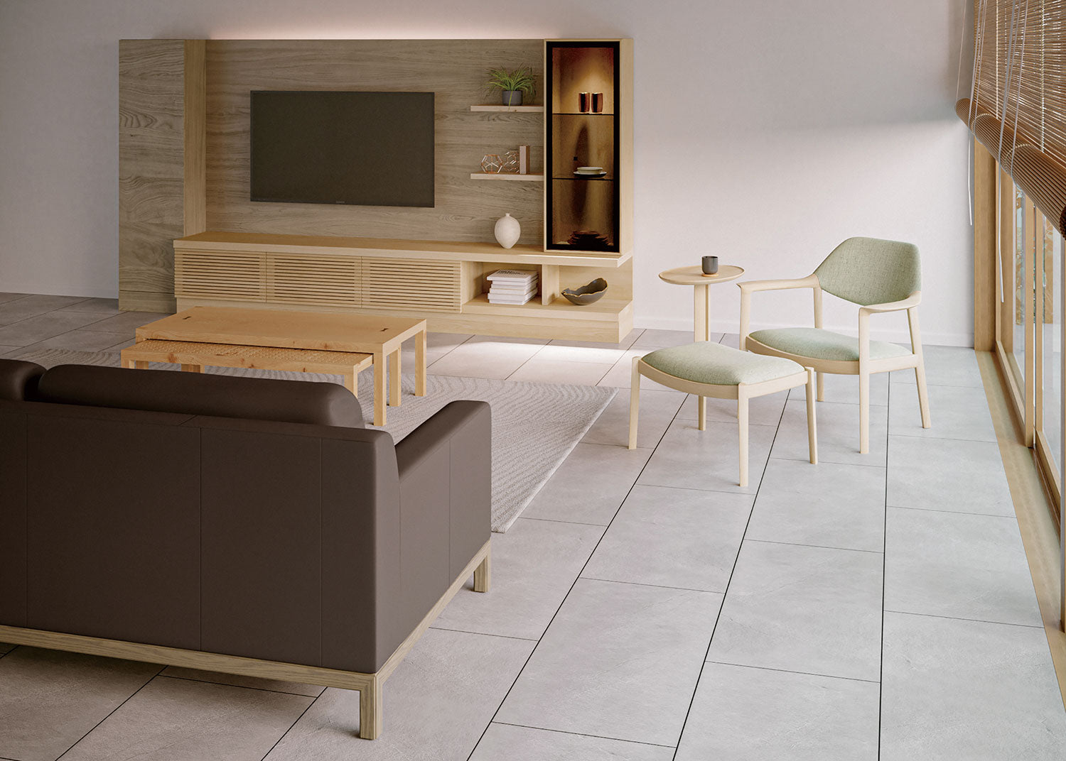 ひとつひとつの工程に手をかけた、豊かな量感と繊細なライン。デザイナーの佐戸川清氏が自然の美しさから生み出したデザインを、木質感あふれる上質なLUXシリーズとしてつくり上げました。枝の分かれ目や葉脈といった、樹木の成長時に宿る力強い造形が、膨らみをもった三角形の共通モチーフとして脚などに表現されています。細部まで手間を惜しまず仕上げることで、シリーズ全体の上質感を表現しています。
