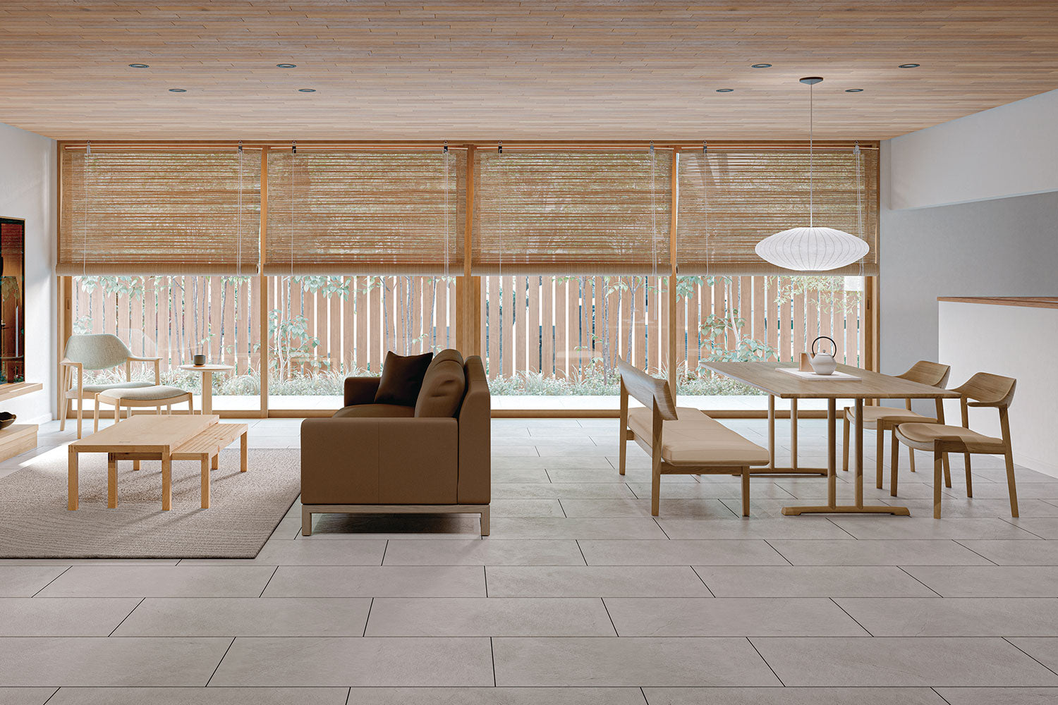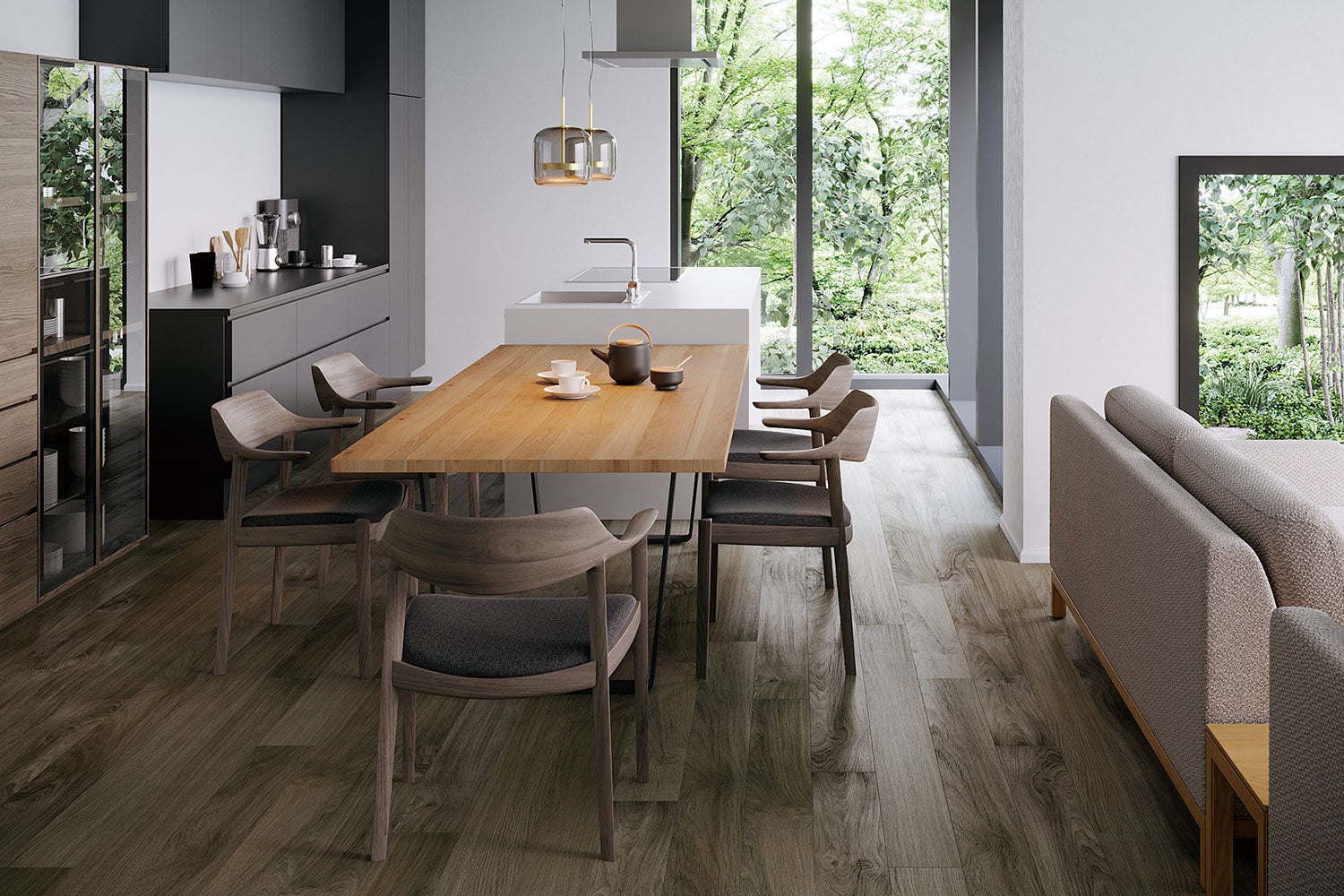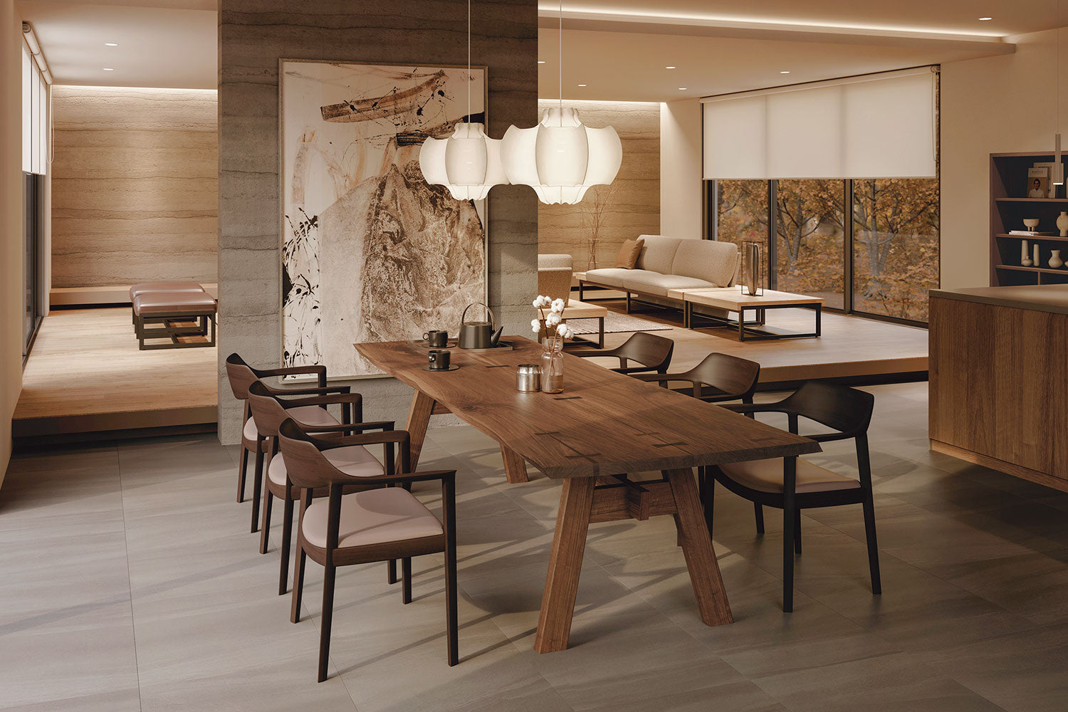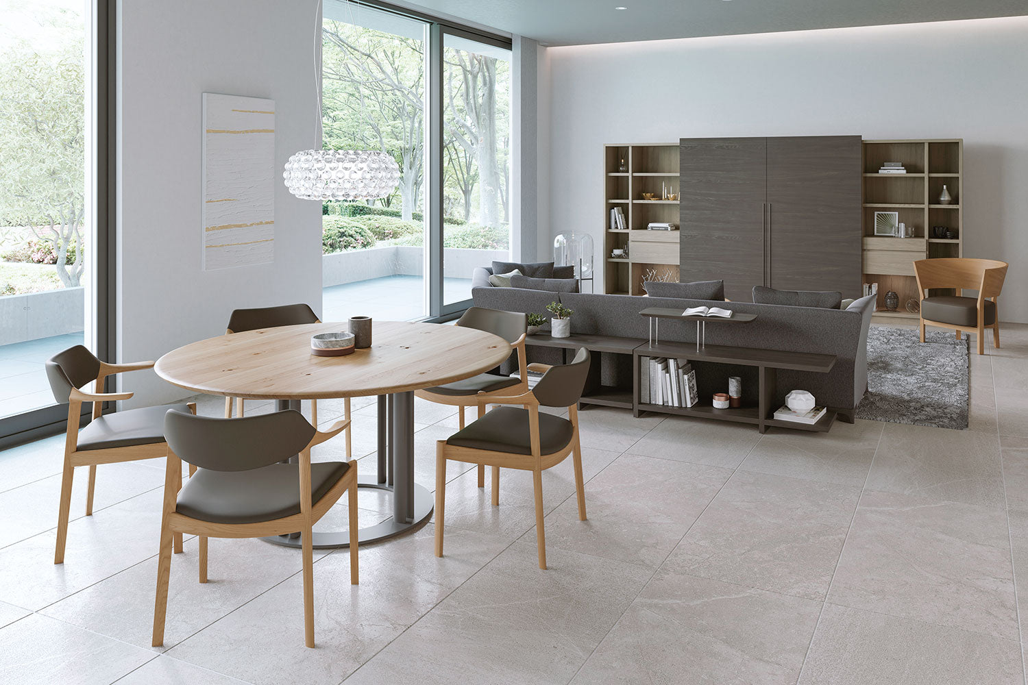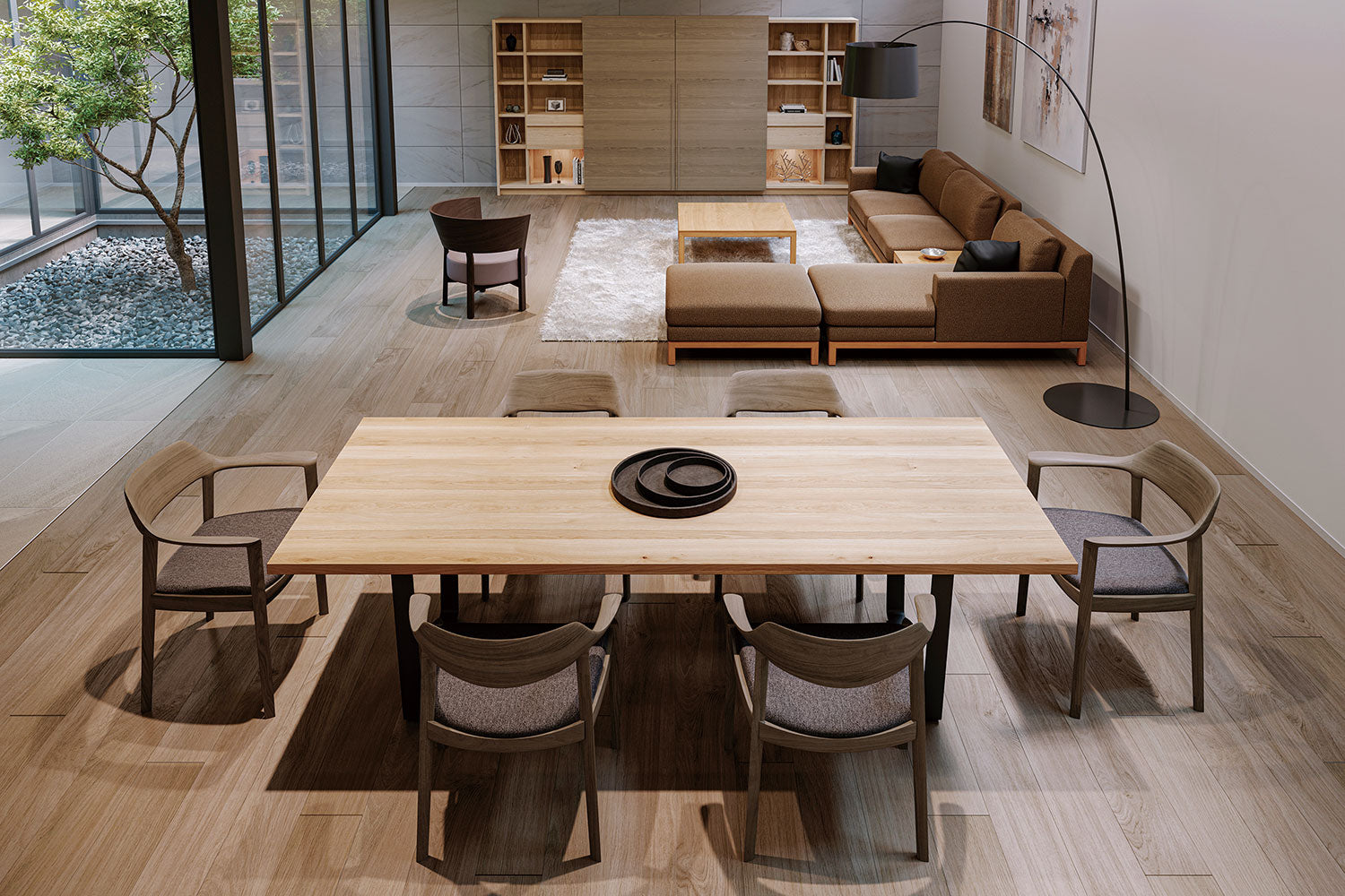 ひとつひとつの工程に手をかけた、豊かな量感と繊細なライン。デザイナーの佐戸川清氏が自然の美しさから生み出したデザインを、木質感あふれる上質なLUXシリーズとしてつくり上げました。枝の分かれ目や葉脈といった、樹木の成長時に宿る力強い造形が、膨らみを持った三角形の共通モチーフとして脚などに表現されています。細部まで手間を惜しまず仕上げることで、シリーズ全体の上質感を表現しています。