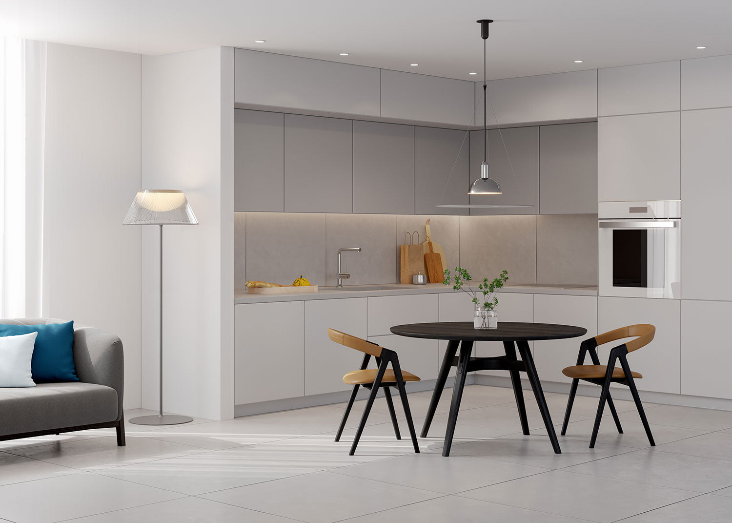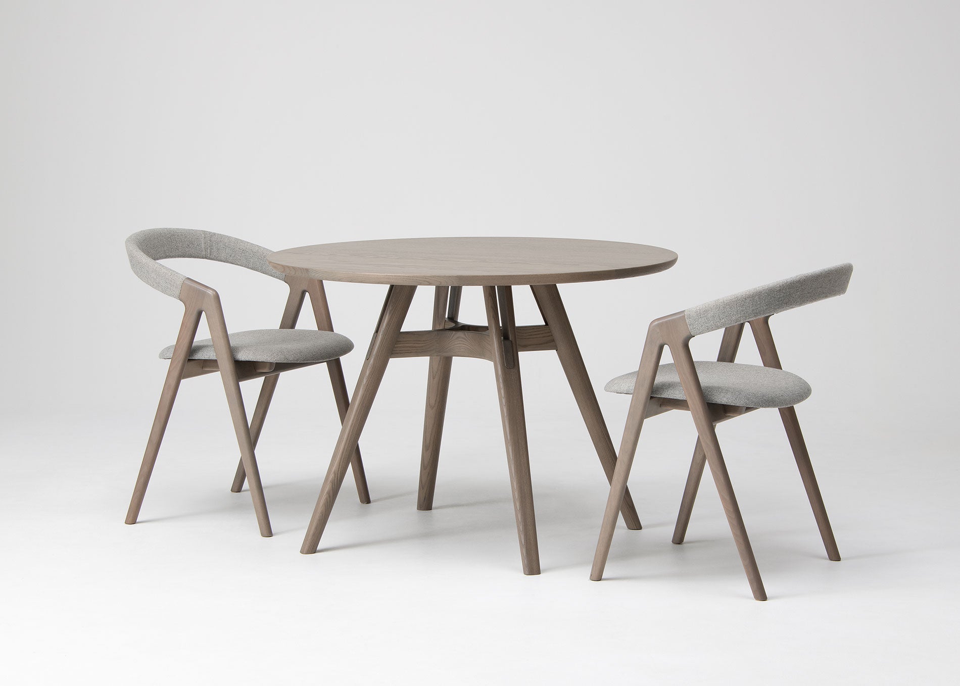 豊かな木質感と脚まわりの軽快感が魅力のラウンドテーブル「YON(ヨン)」。独創的なデザインの貫が四方に伸びる脚を支え、座る人の足元に広いスペースを確保しています。ドイツ人デザイナーのミヒャエル・シュナイダー氏も「精緻な日本の木工技術が可能にした、強さと美しさ」と完成度を評価し、「カフェやレストランに並んだ景色も、ダイニングで家族が団欒する様子も美しいはず」と話します。カバやタモなど北海道産材4樹種での展開で、さまざまな椅子とのコーディネートに幅広く対応しスタイリングの質を高めます。