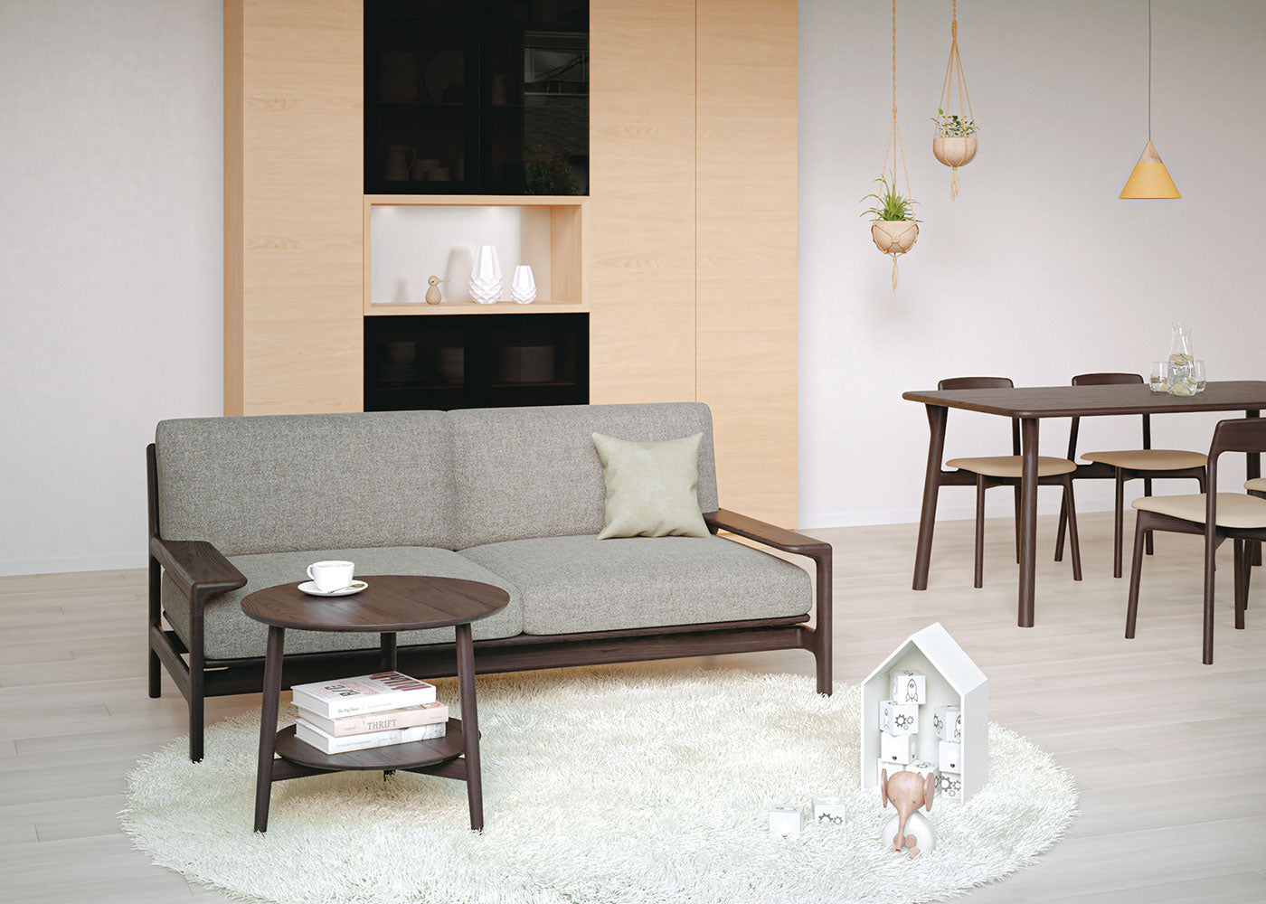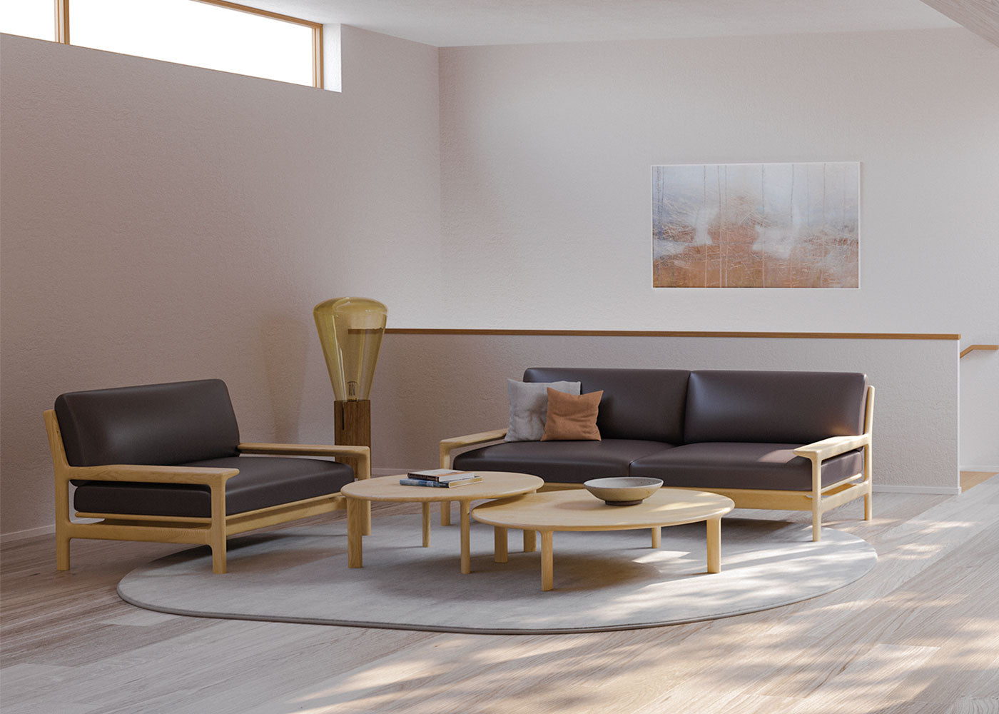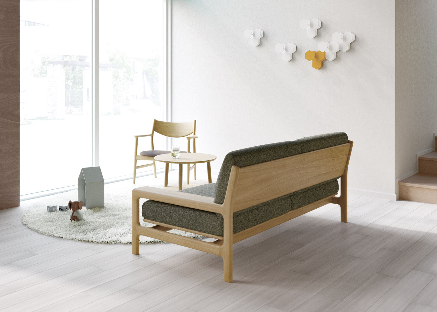 「都市部の高層マンションで選ばれるソファー」をコンセプトにした開発は、搬入を考えた幅2000mm というサイズからスタート。内向きの肘によって水平が強調されたデザインとなり、「コンパクトで大らかなソファー」の誕生に繋がりました。アームチェアーと組み合わせることで、よりゆったりとしたくつろぎの場が生まれます。