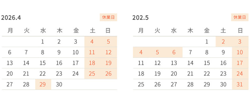 色のついた休業日には、メールの返信および製品の出荷はできませんのでご了承ください。