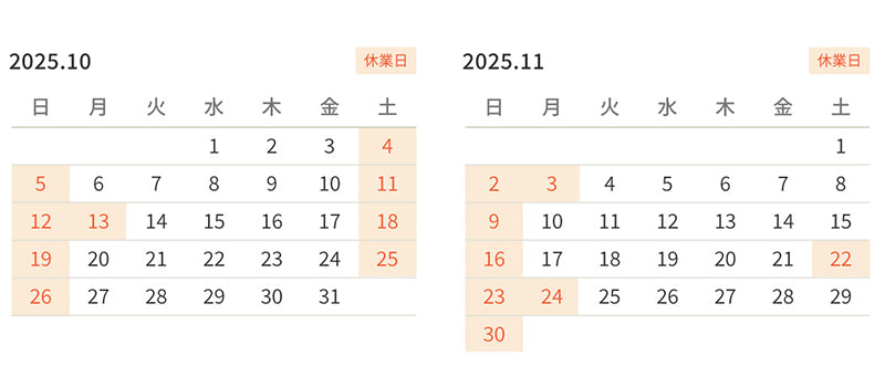 色のついた休業日には、メールの返信および製品の出荷はできませんのでご了承ください。
