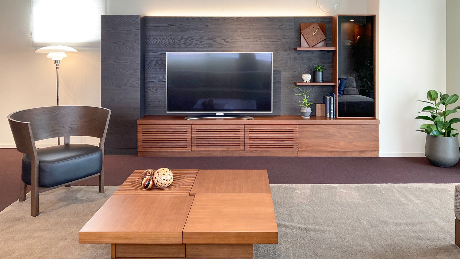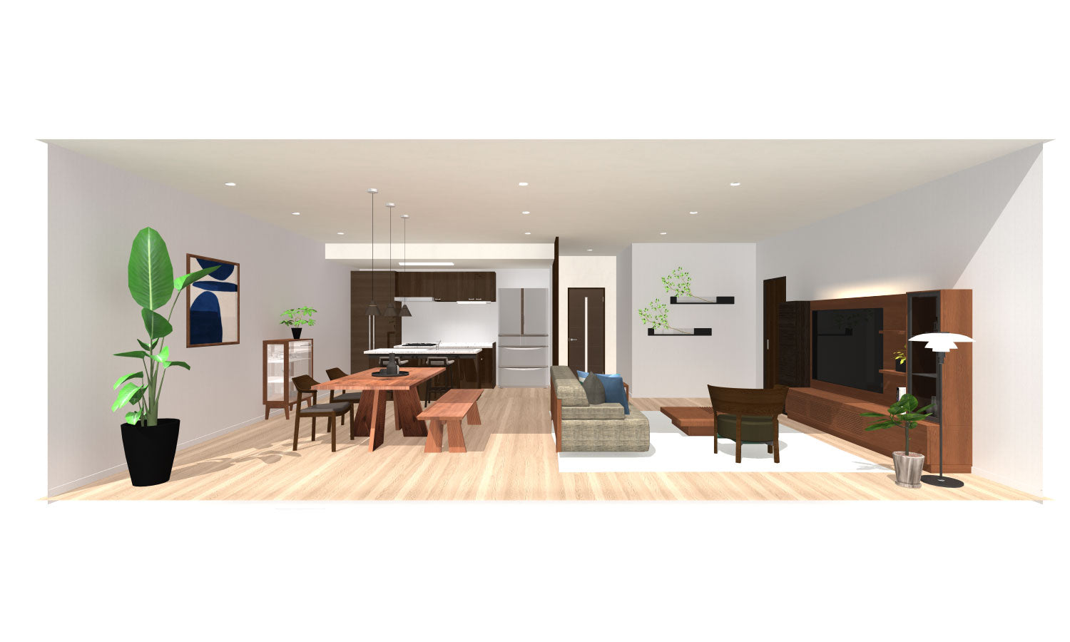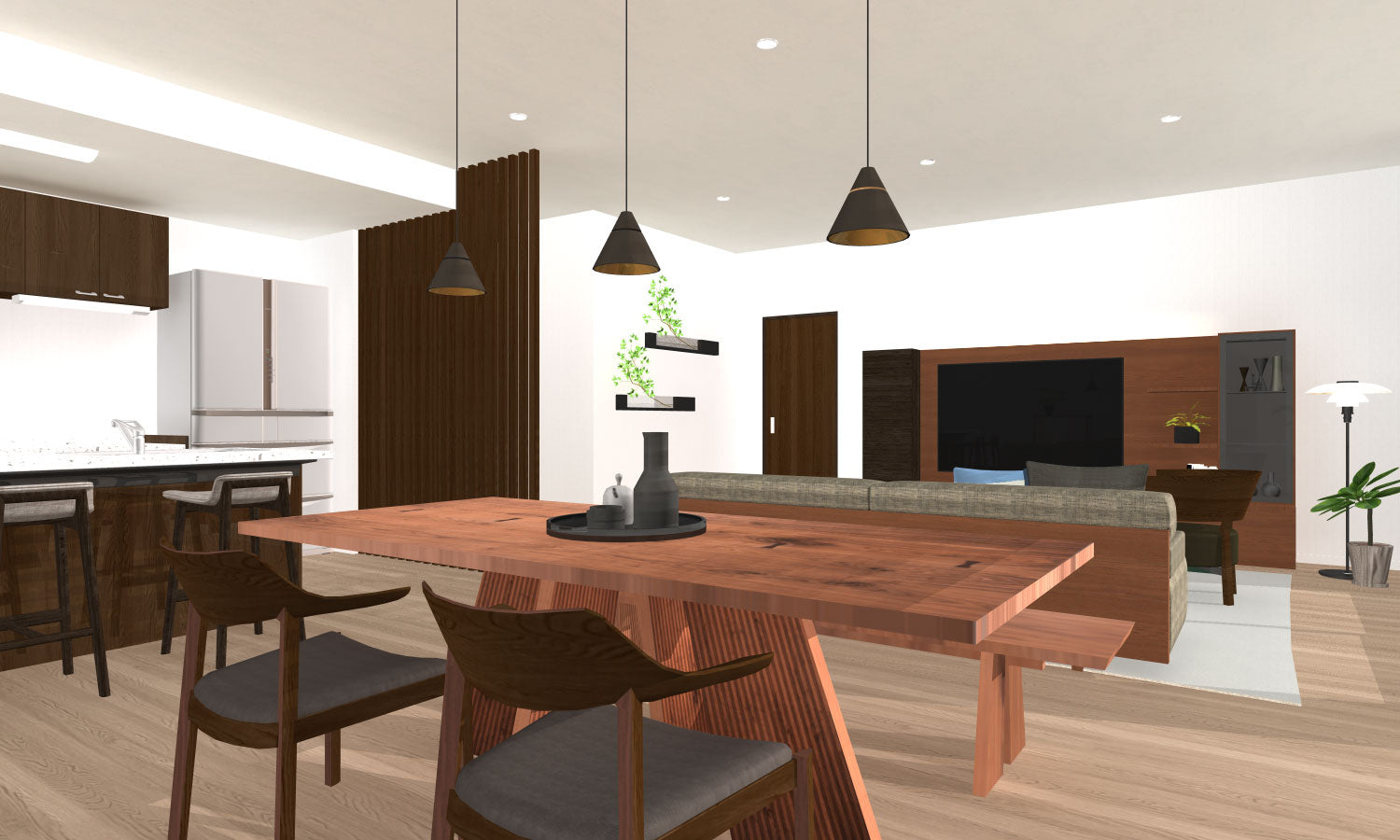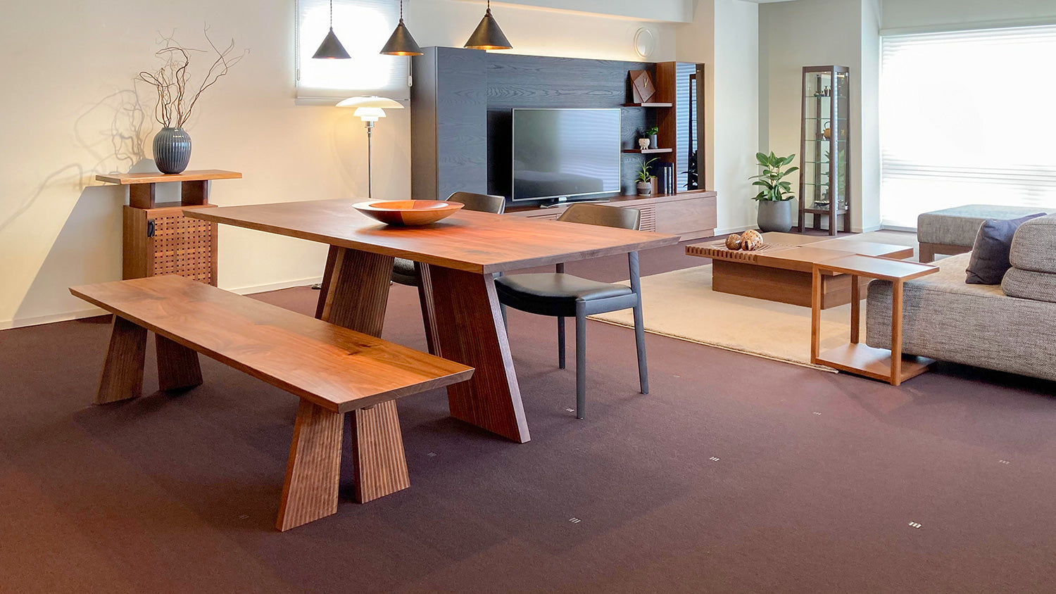 高級感のあるウォルナット材をベースにお部屋をコーディネート。ダイニングテーブルは、デザインにインパクトがある「ハカマ」をポイントに。木のぬくもりを贅沢に感じられる無垢材は、自分でメンテナンスをしながら次の世代へ継ぐこともできます。