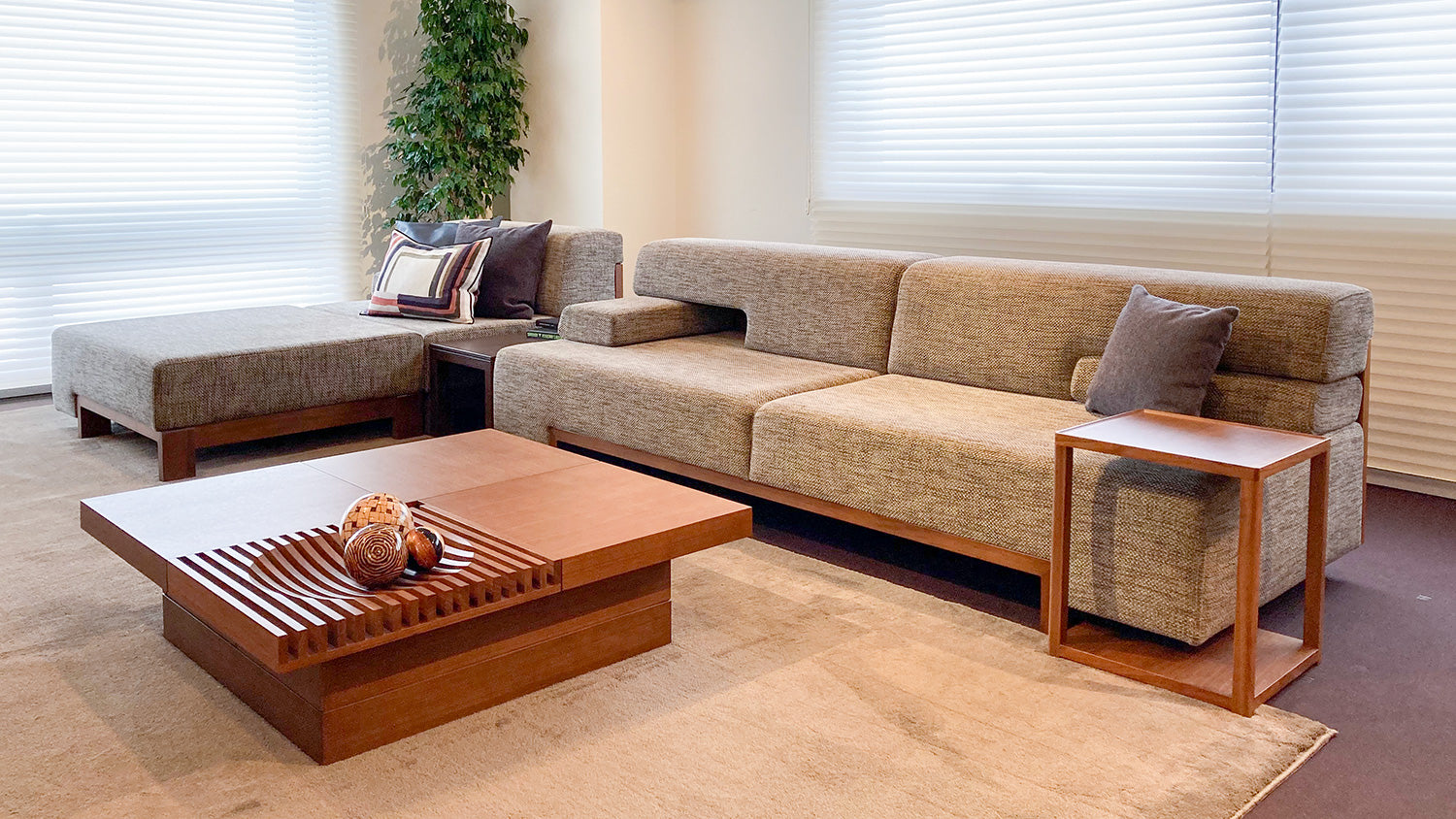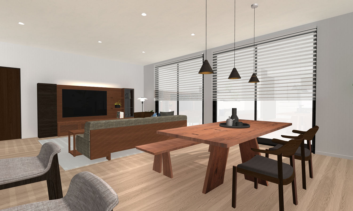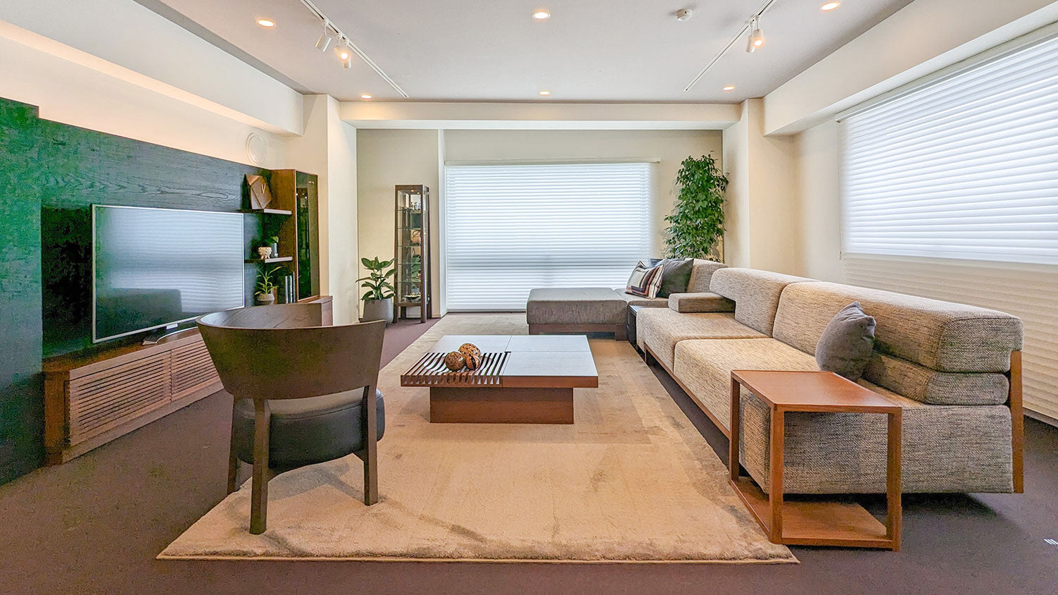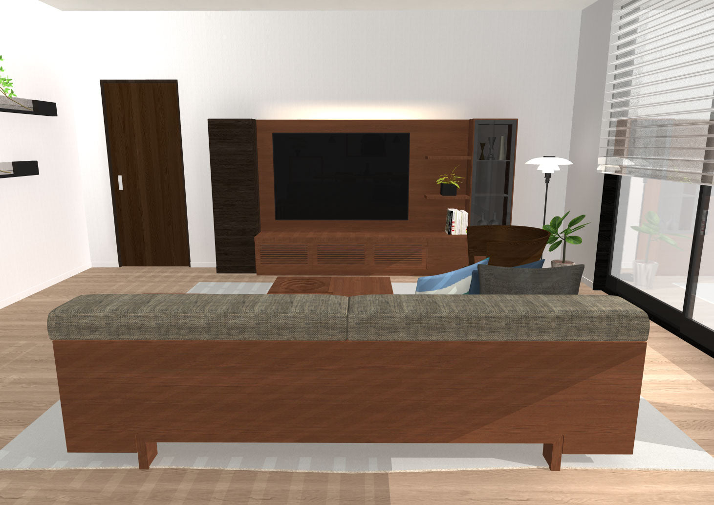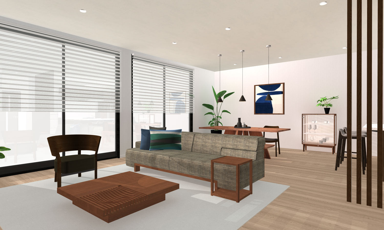 高級感のあるウォルナット材をベースにお部屋をコーディネート。ダイニングテーブルは、デザインにインパクトがある「ハカマ」をポイントに。木のぬくもりを贅沢に感じられる無垢材は、自分でメンテナンスをしながら次の世代へ継ぐこともできます。