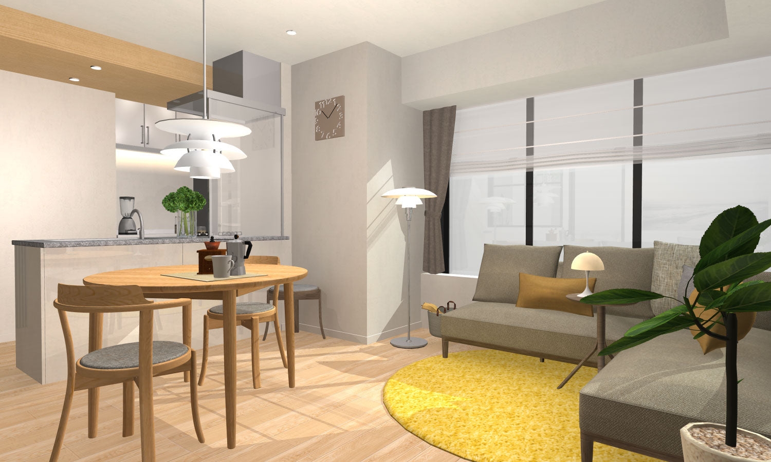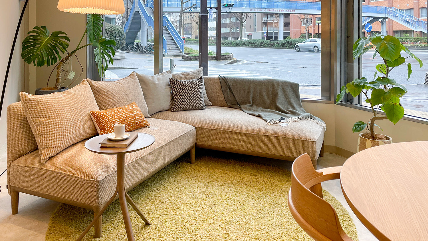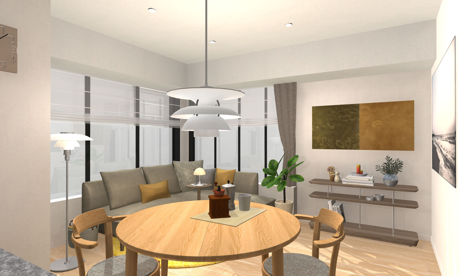 都心部マンションに二人暮らしのインテリア。限りがある空間でも、可変性の高い家具を選ぶことで用途や気分に合わせて過ごしかたを変えられる、自由度の高さがポイントです。