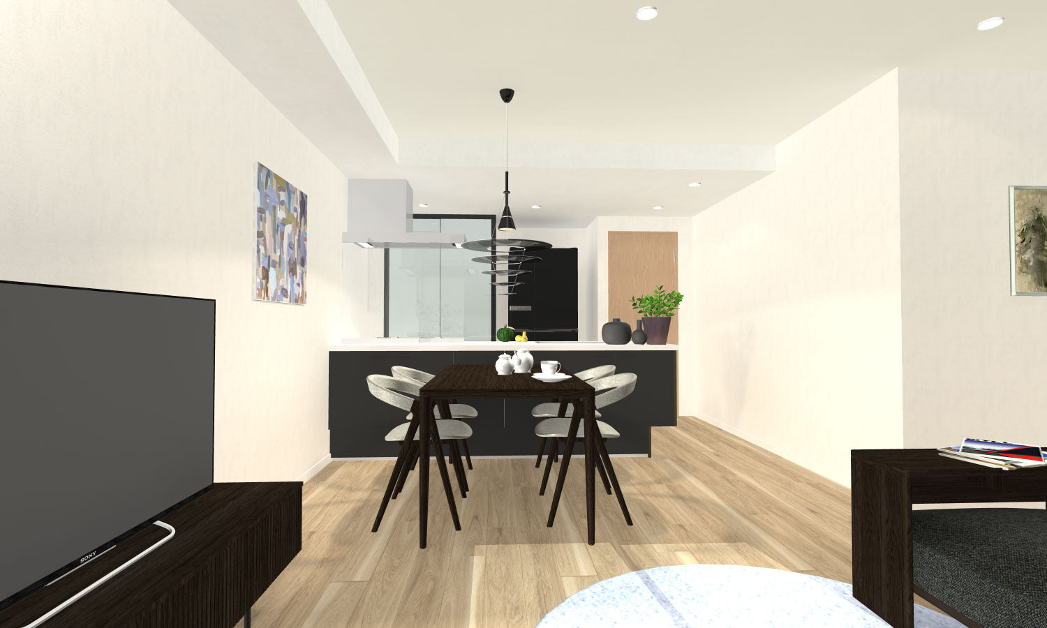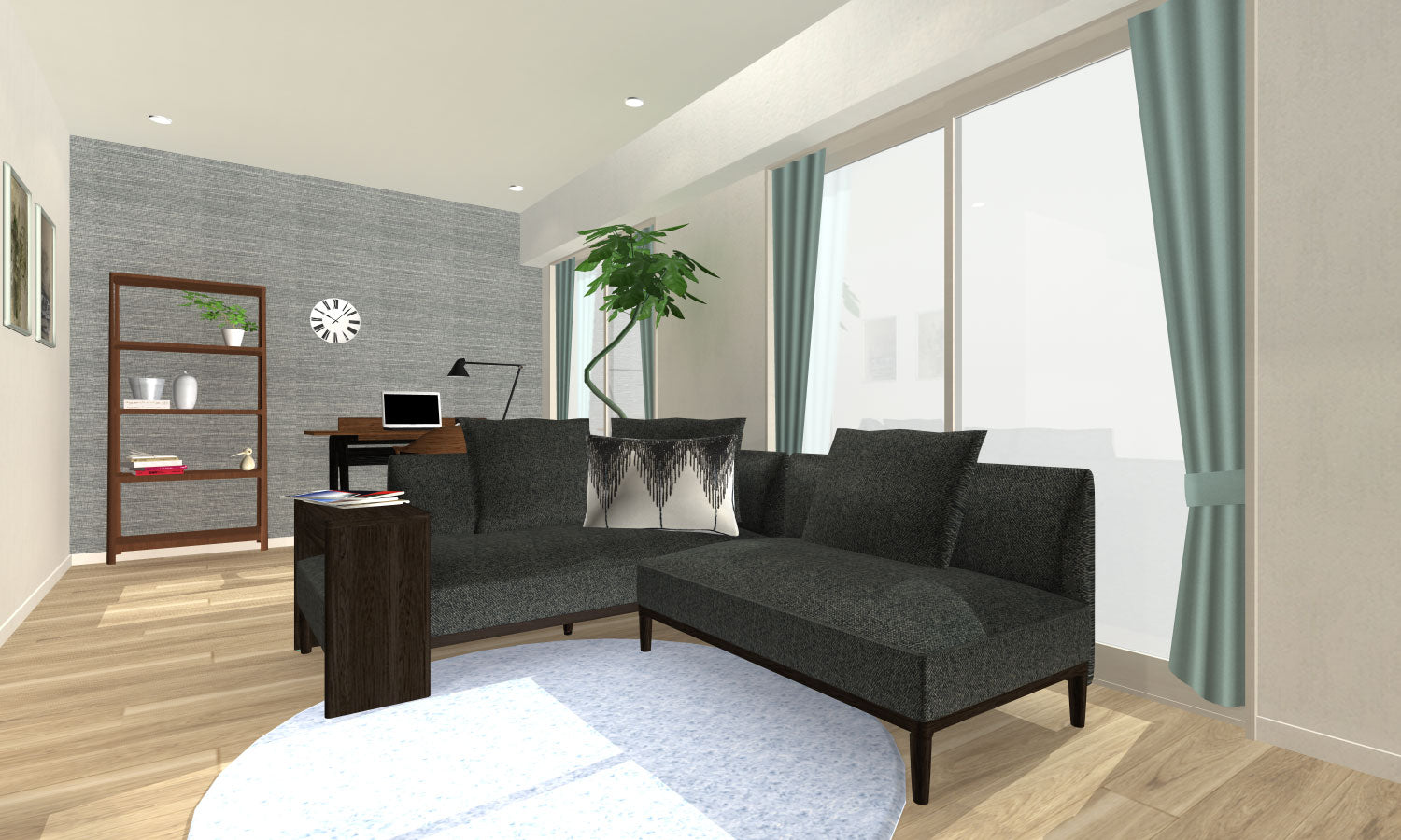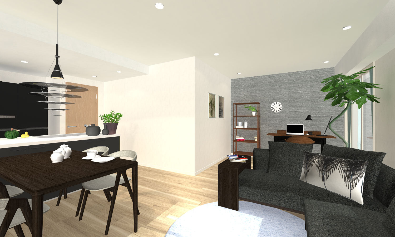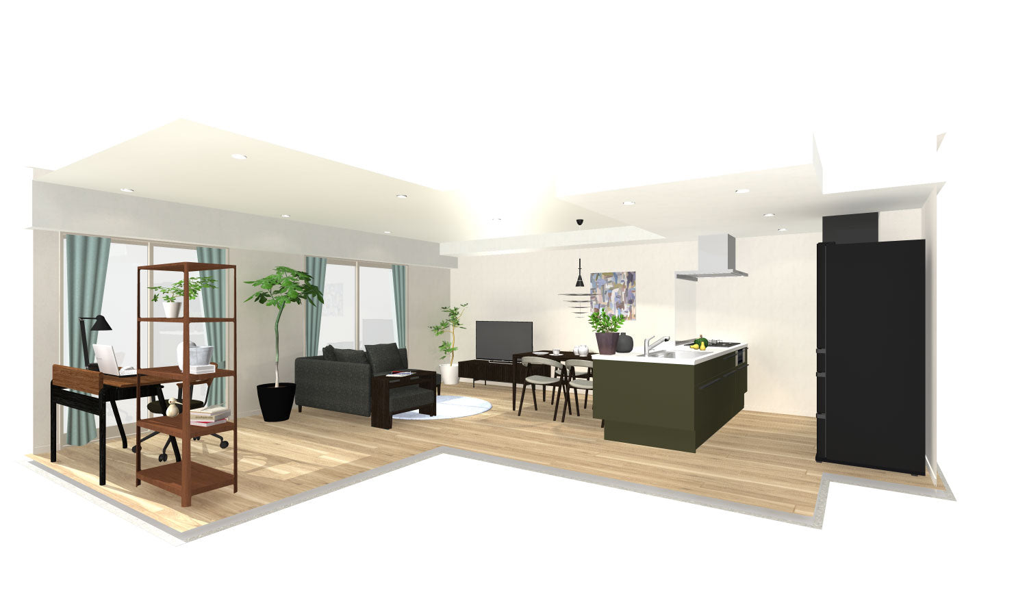 ソファーでワークスペースとLD空間を分けることで、コンパクトながら解放感ある2つのスペースを演出。シンプルな配色で、グリーンやアートをアクセントに。