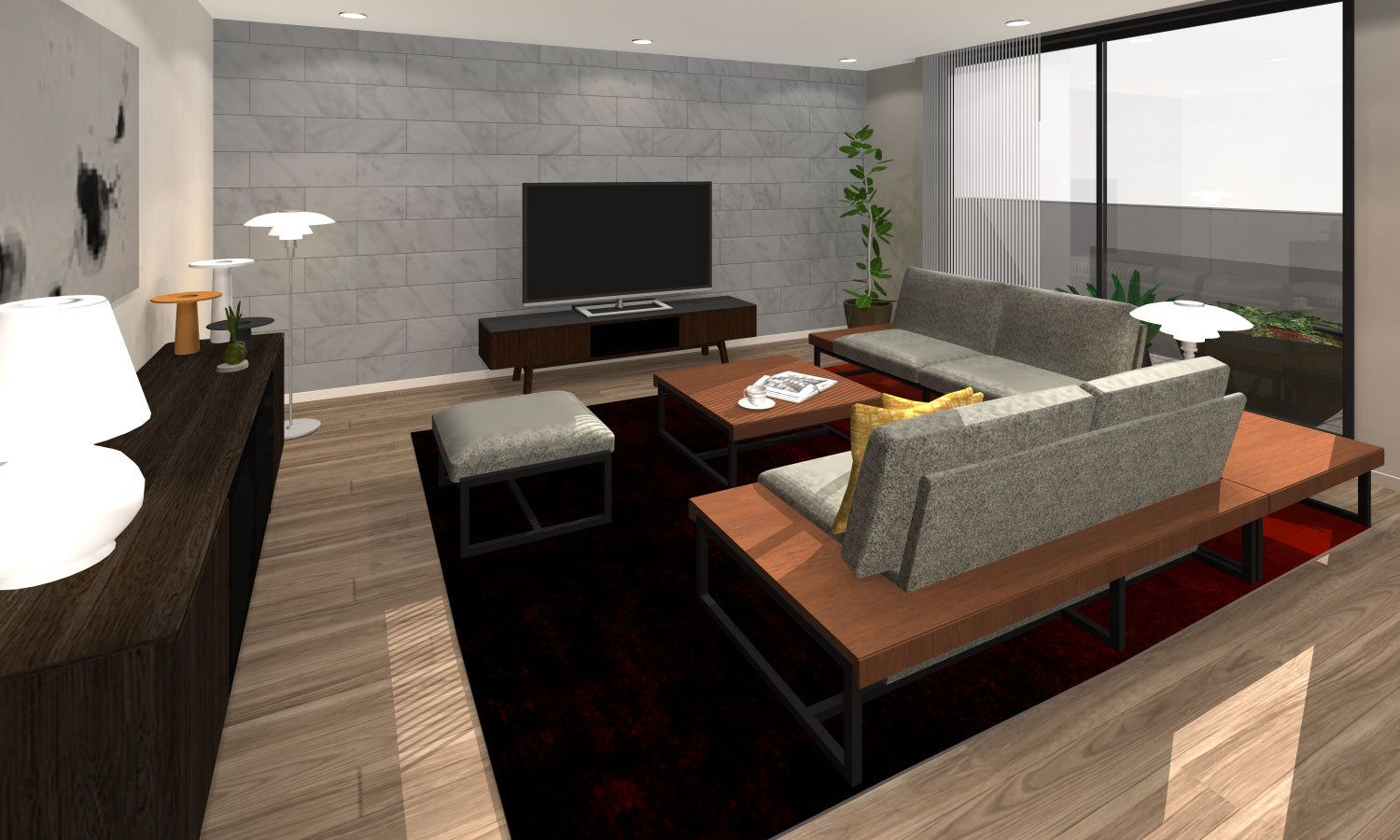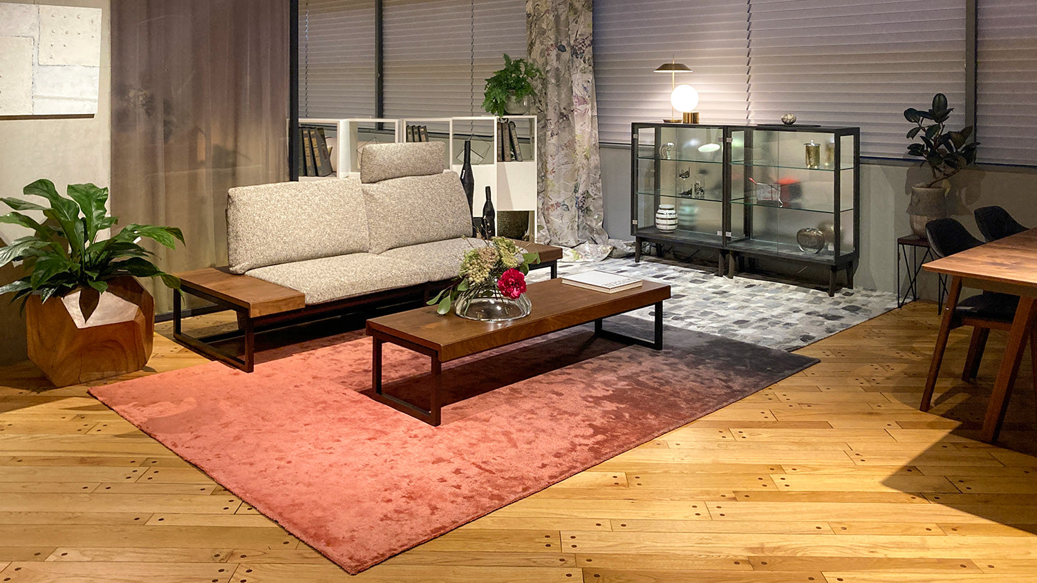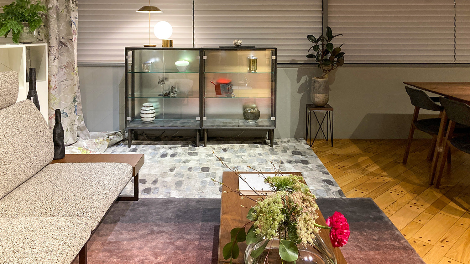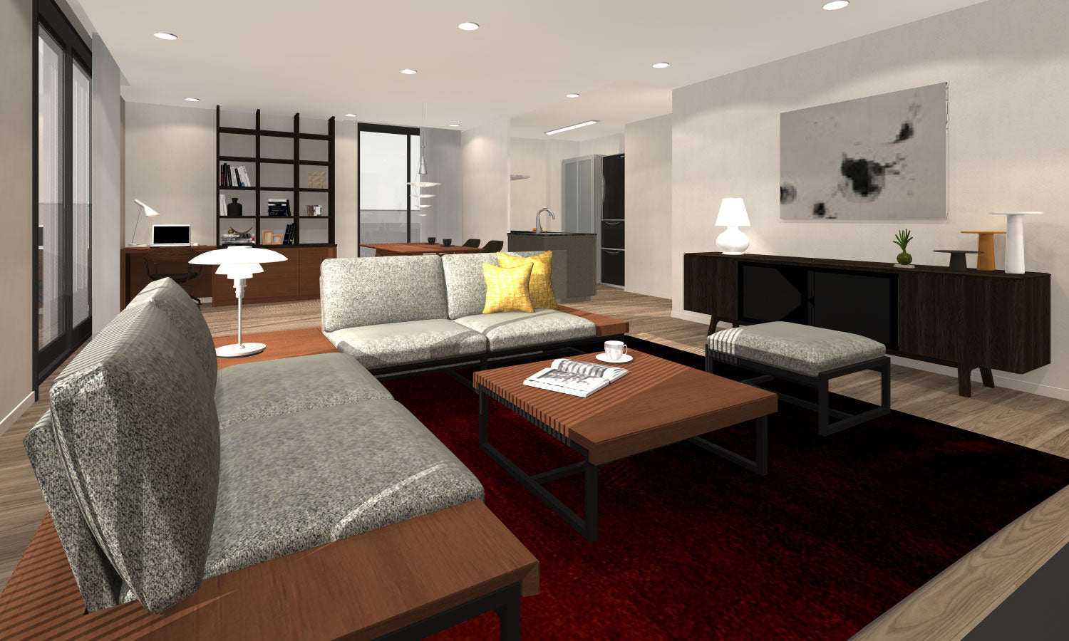 来客にも対応できるリビングコーナーをゆったりとしつらえた空間提案です。ウォルナットをベースカラーとして、張地はモノトーンで都会的な印象に。窓周りも家具の直線的な形にあわせ、バーチカルブラインドをセレクト。ポイントで発色のよいラグが上質な室内を彩ります。クッションやサイドボード上の花器でアクセントをつけました。