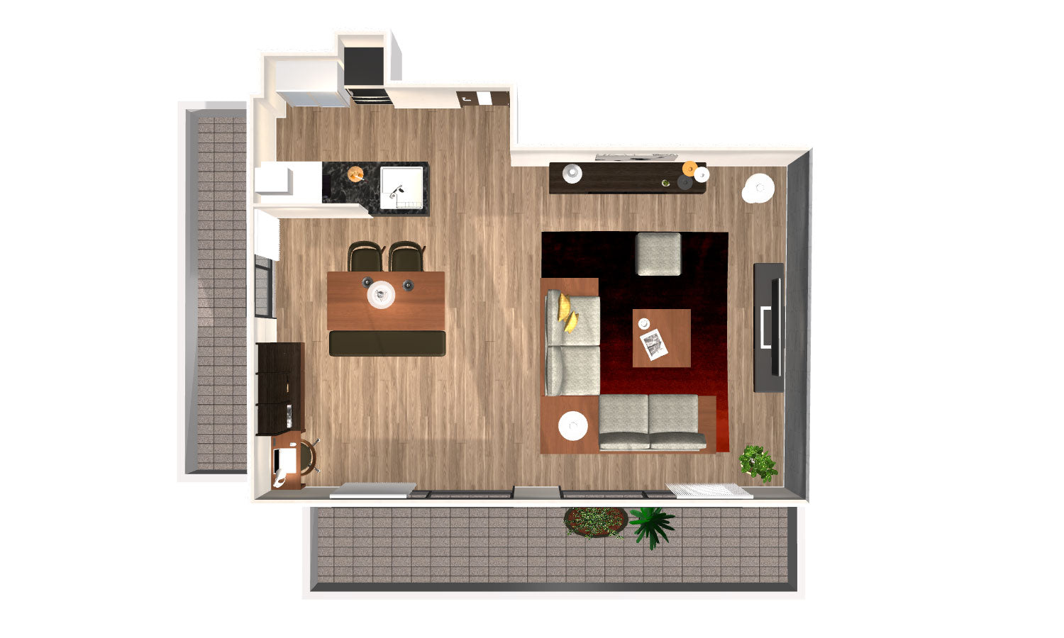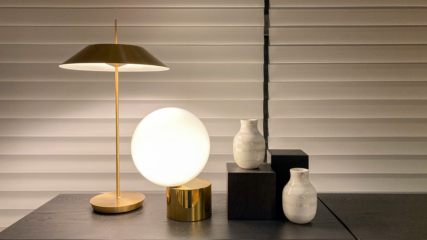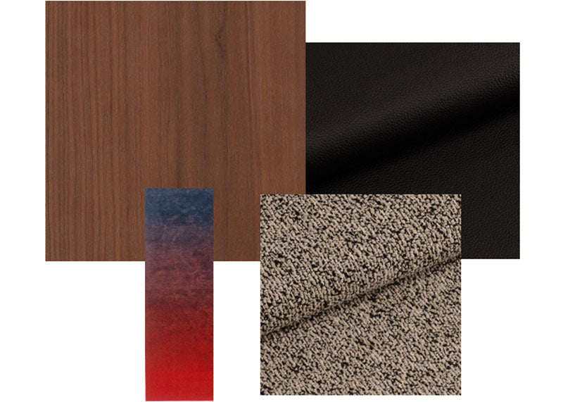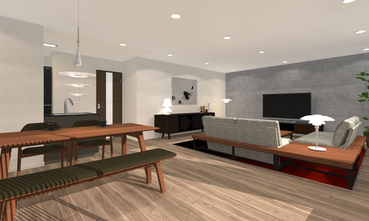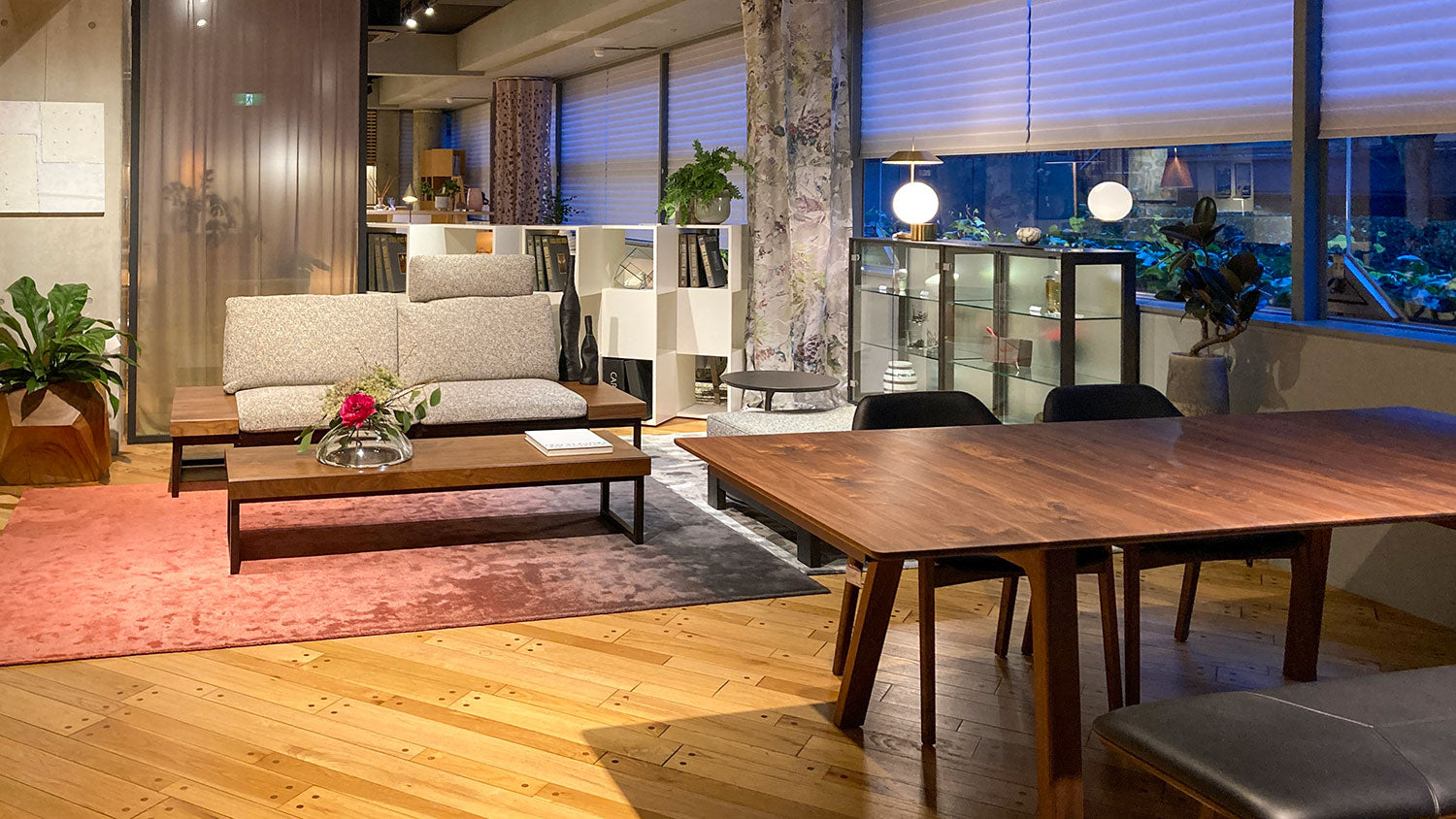 来客にも対応できるリビングコーナーをゆったりとしつらえた空間提案です。ウォルナットをベースカラーとして、張地はモノトーンで都会的な印象に。窓周りも家具の直線的な形にあわせ、バーチカルブラインドをセレクト。ポイントで発色のよいラグが上質な室内を彩ります。クッションやサイドボード上の花器でアクセントをつけました。