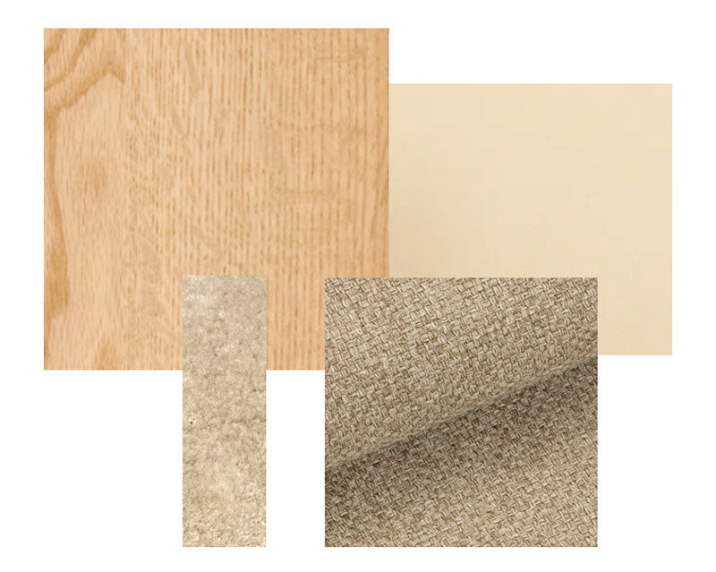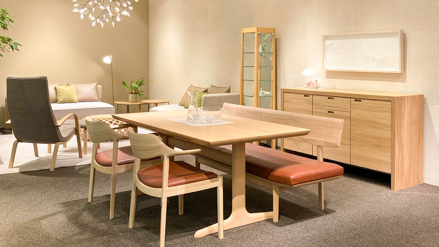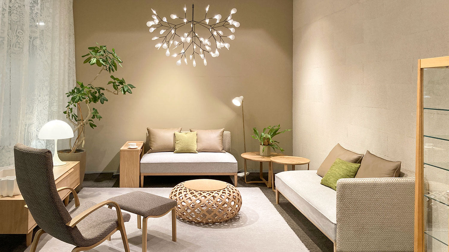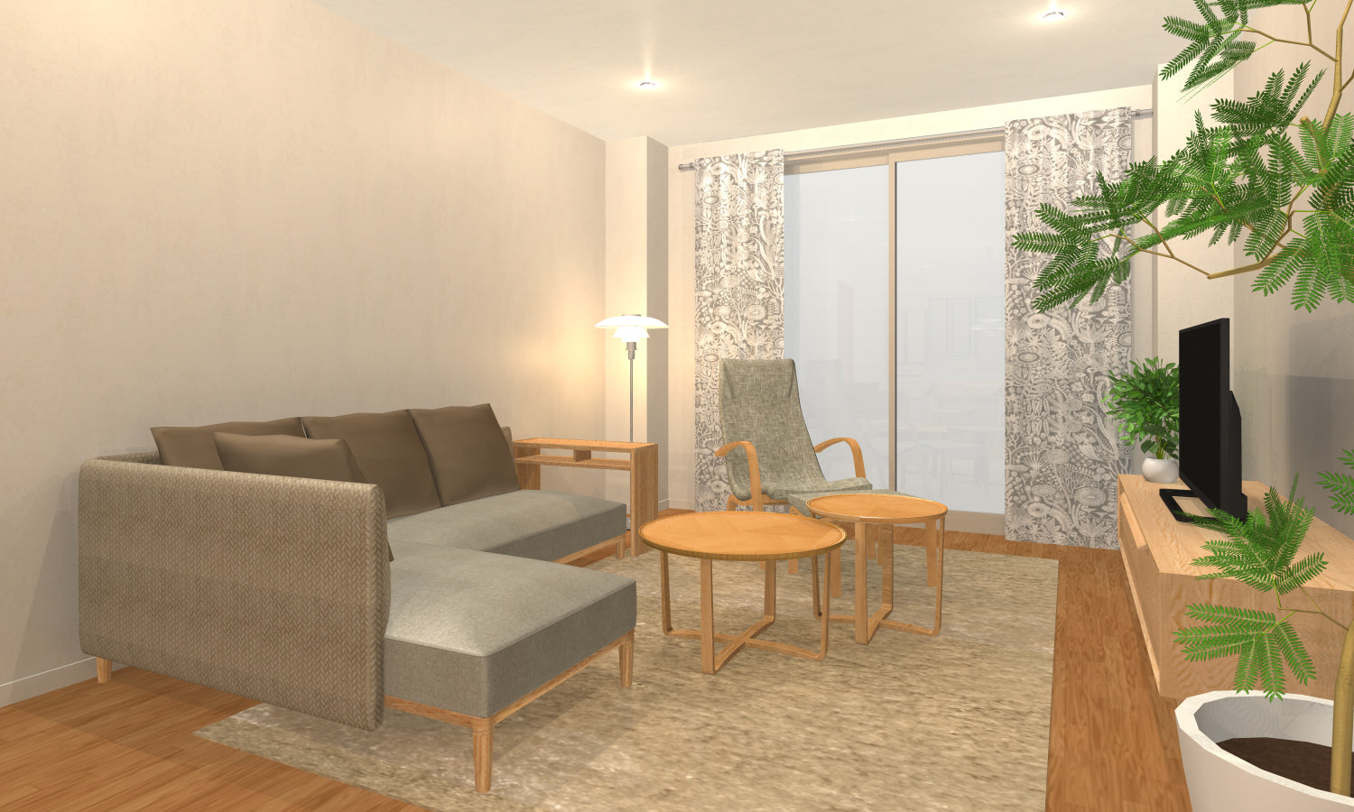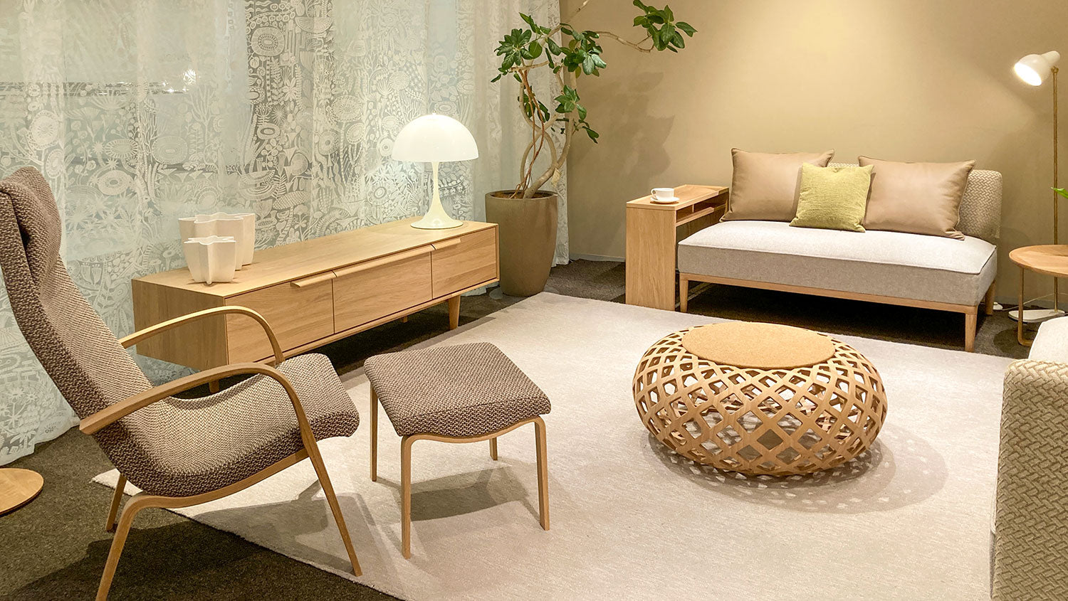 家具は丸みがあり、ゆったりとしたイメージに。合わせる小物として、無彩色のアートや「白」単色の植物柄レースカーテンを取り入れ、シンプルさの中に馴染む ”好き” を楽しめる要素を加えました。