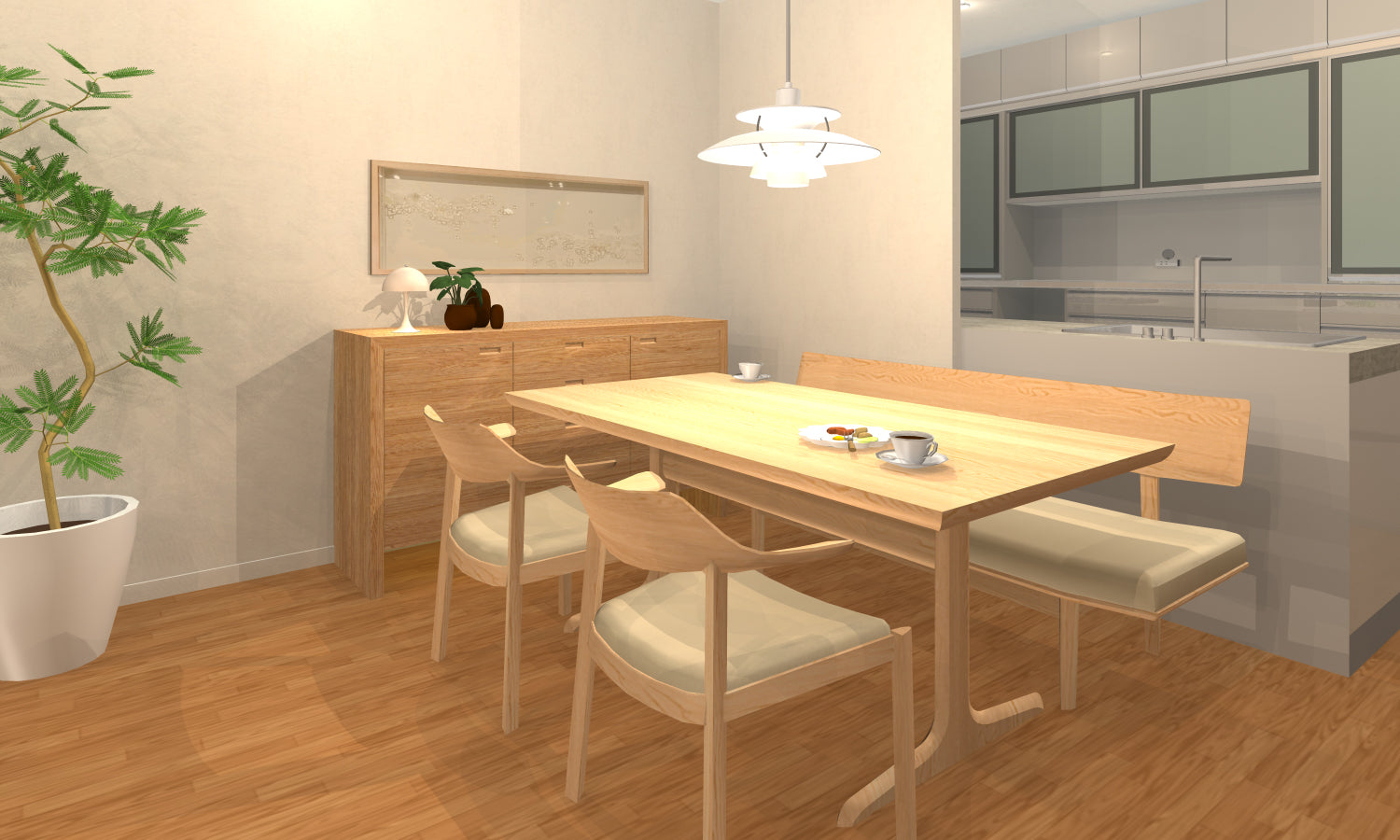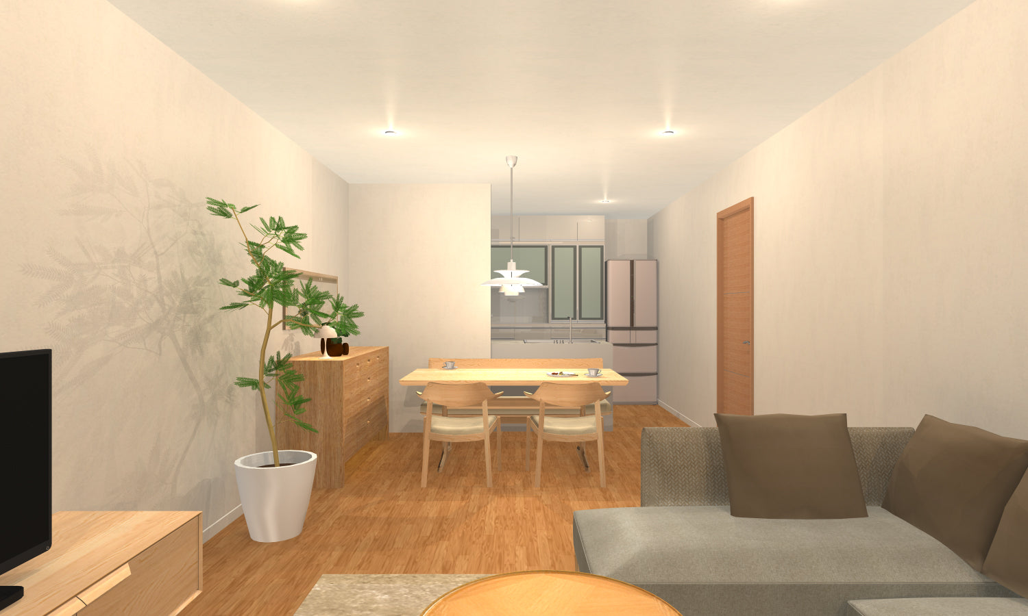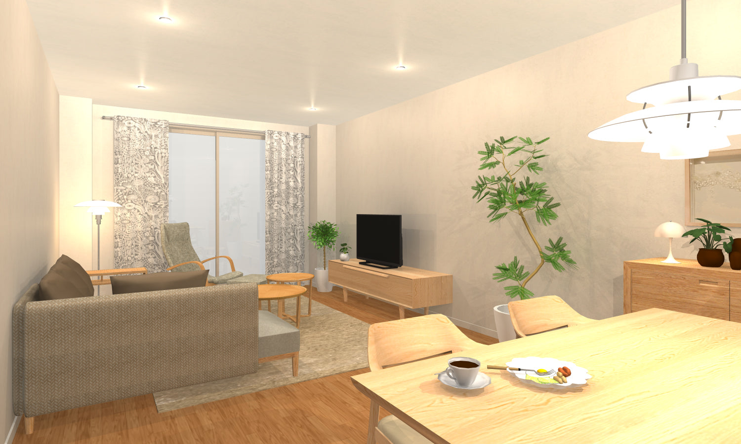 主に家で過ごす植物好きな奥さま寄りの、やわらかくシンプルなLD空間がテーマ。
