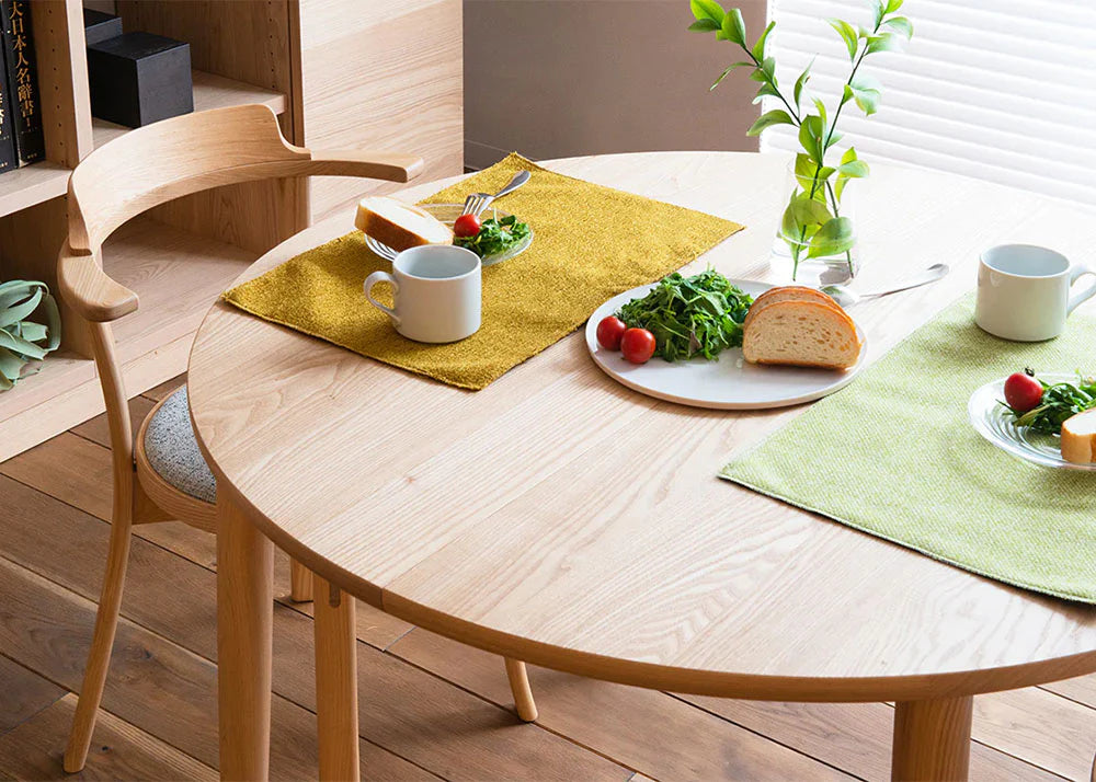 人気の丸テーブルや伸長式テーブル、無垢材の天板など、豊富なサイズやカラーをご用意しております。お選びいただいたテーブルにぴったりのランチョンマットを、特別なギフトとしてお届けいたします。
