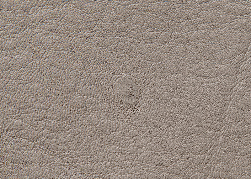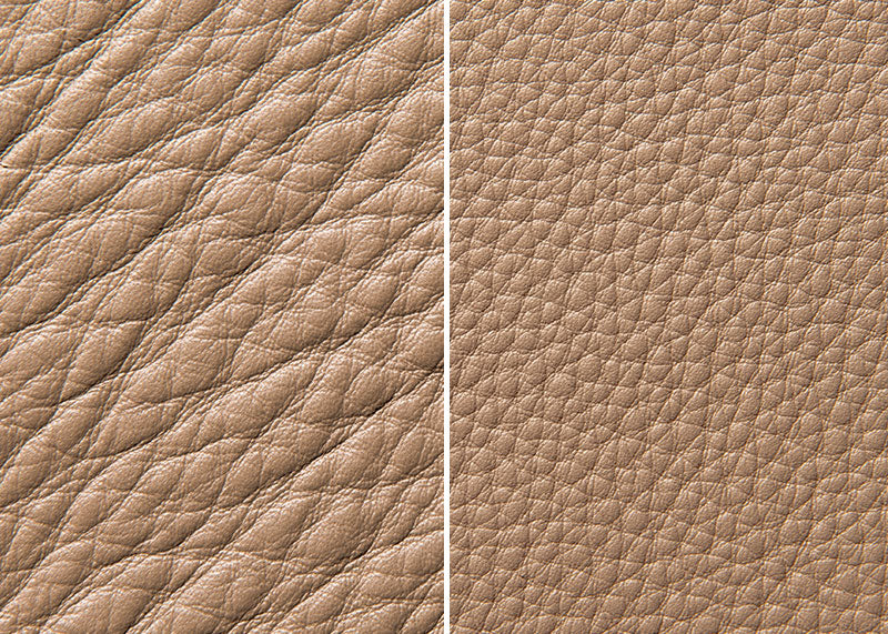 硬めでしっかりとした厚みと大きめの「シボ(革の皺)」が特長。ソファー向けの顔料+型押しタイプで汚れや傷が付きにくい。